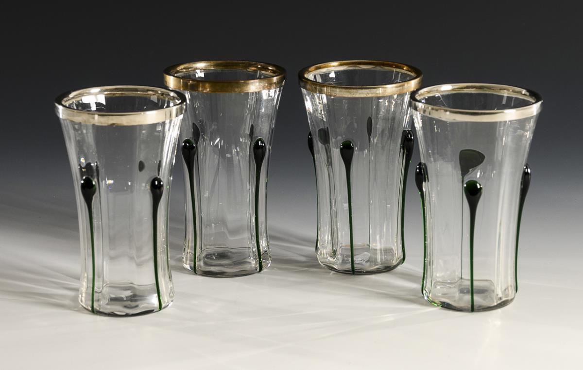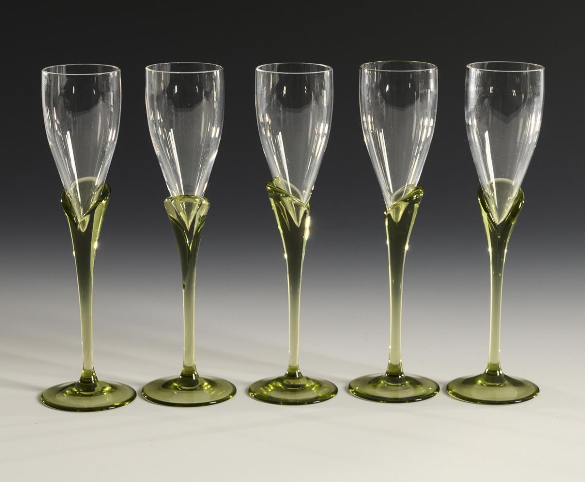 4x Bavarian Forest, c. 1900: lengthwise optically blown goblets made of colorless glass with four fused, elongated green glass drops and metal mounting on the rim (h 12.5 cm). / 5x 2nd half 20th century: small champagne glasses with colorless glass bowl and stem and round base made of green glass (H 19 cm).