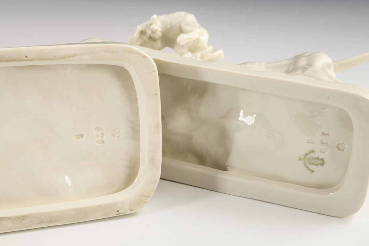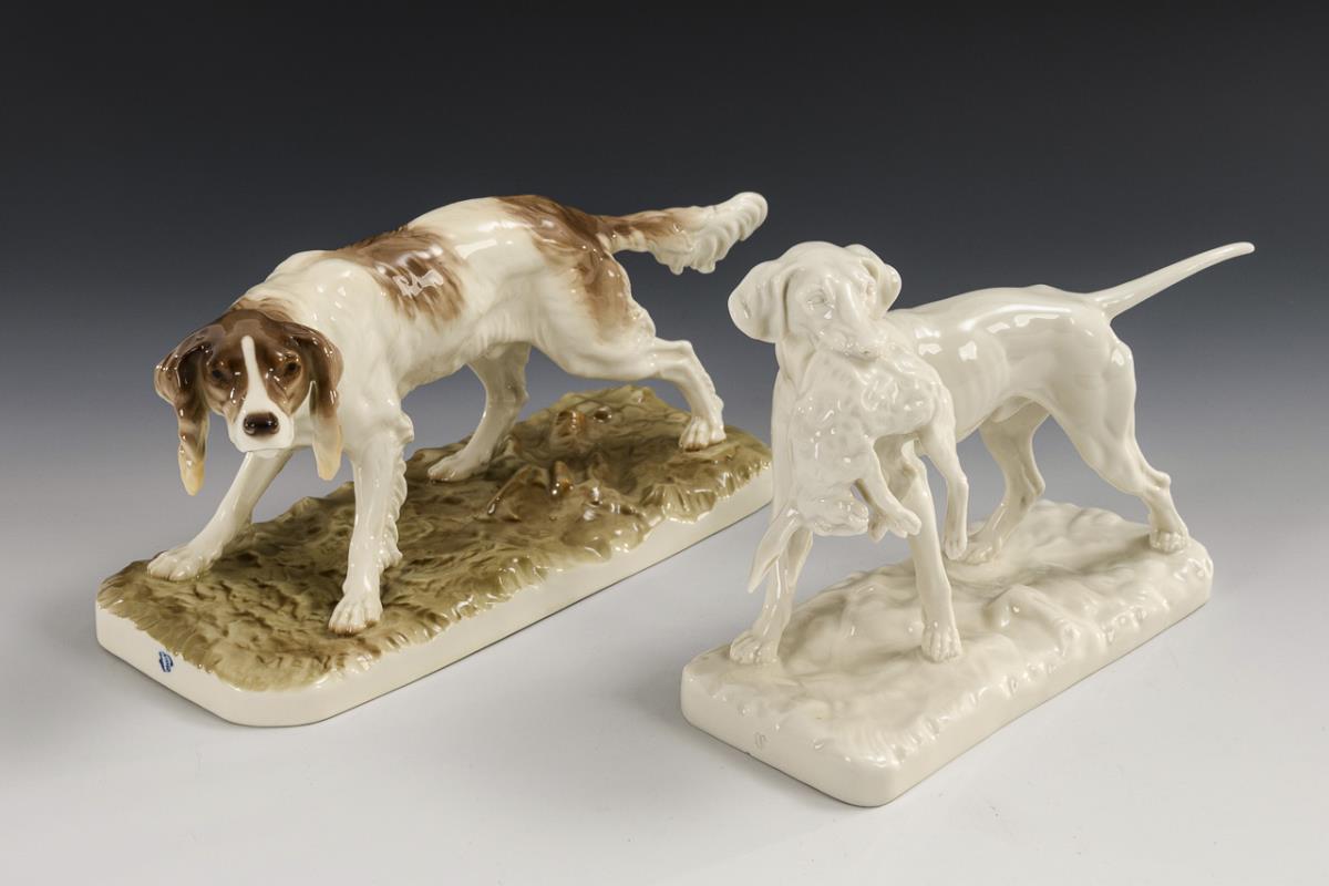 1x model no. 429, designed in 1905 by Pierre Jules Mêne (1810-1879): Setter on a natural base (H 12 cm). / 1x model no. 150, design 1905 by Pierre Jules Mêne: Hunting dog with hare (H 14.5 cm).