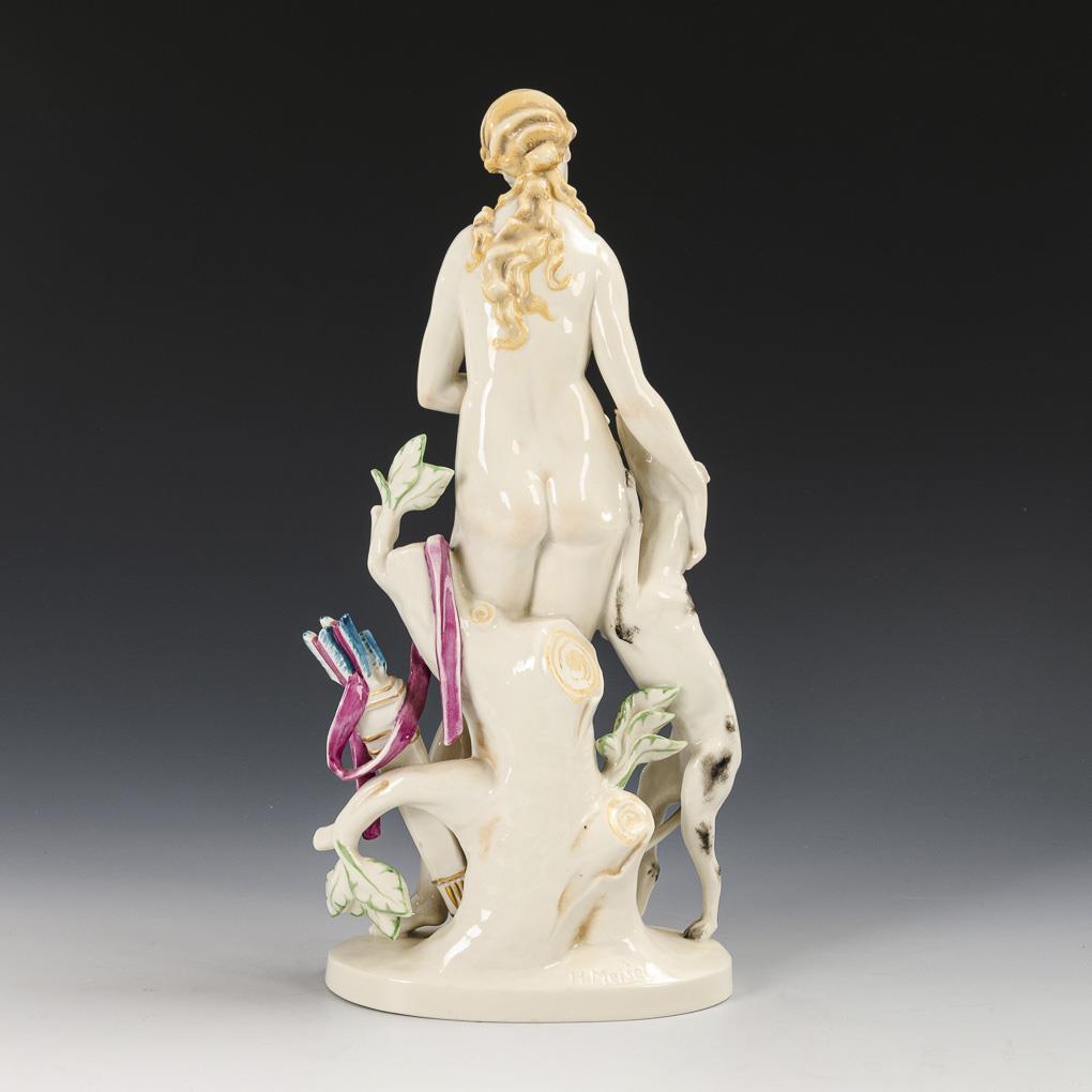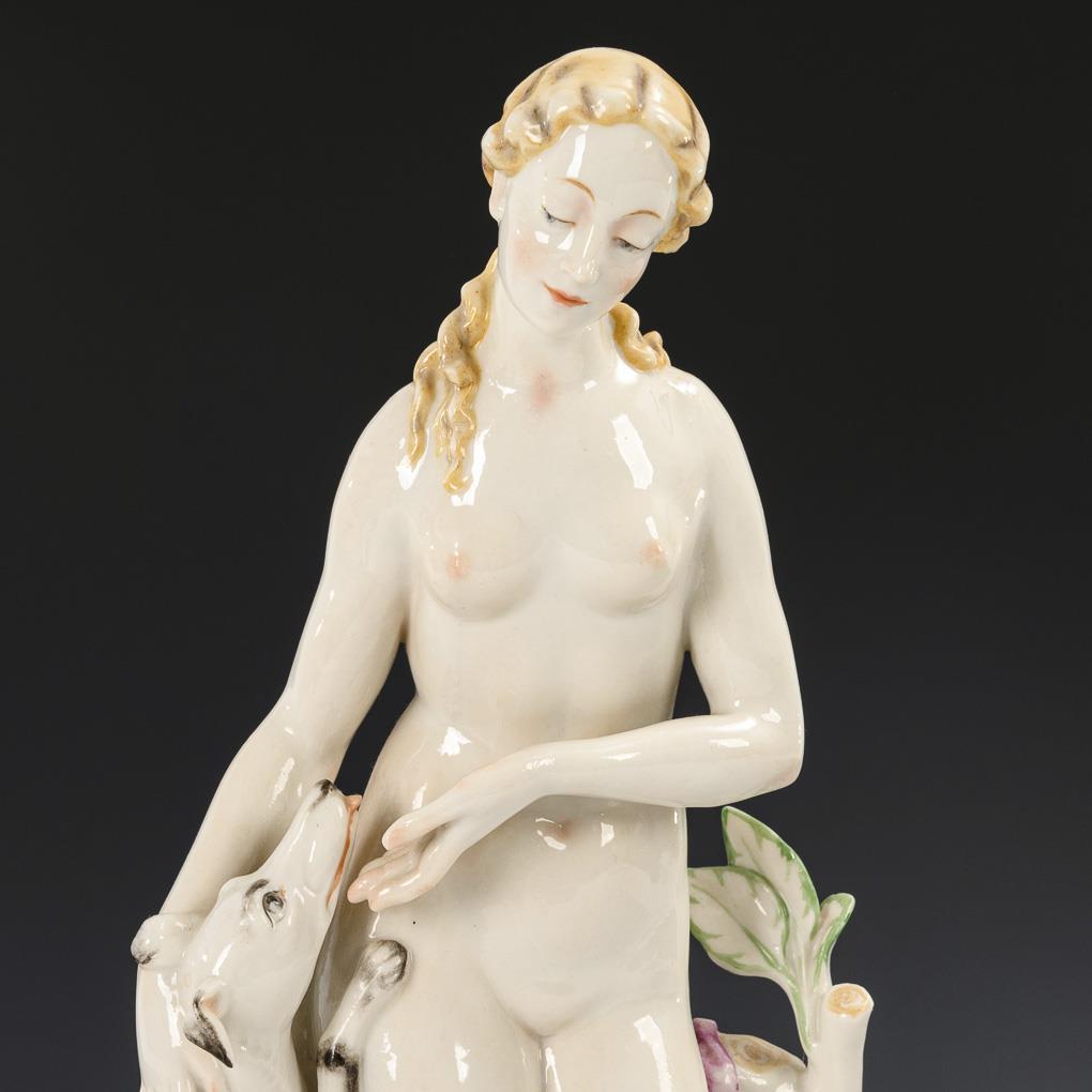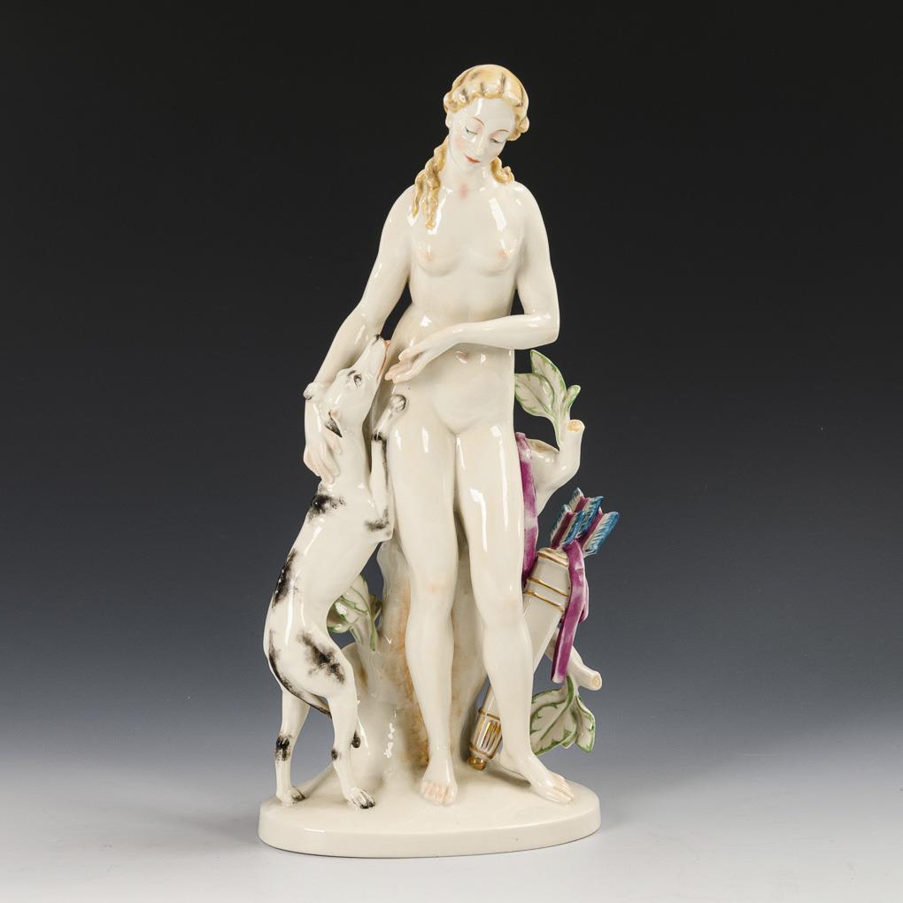 Standing female nude as Diana, goddess of the hunt, with greyhound and quiver with arrows.