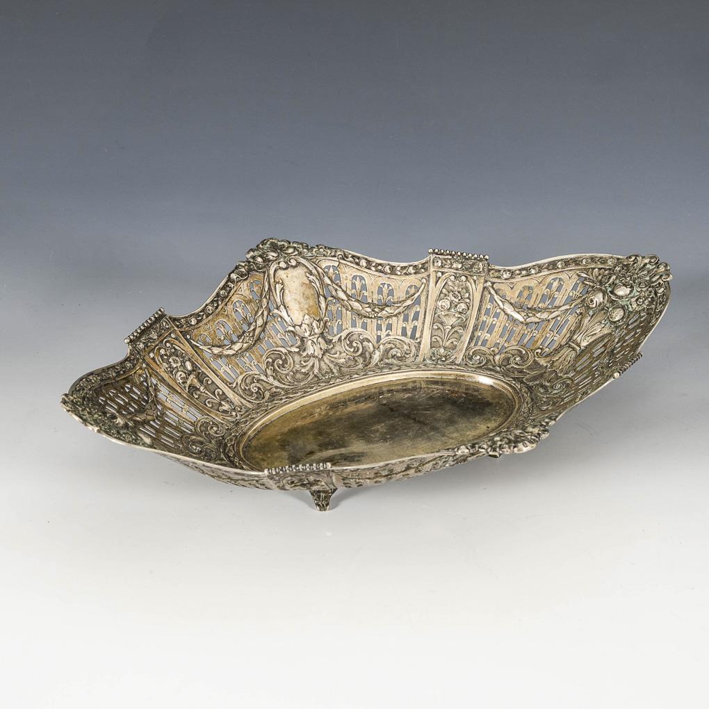 Open-worked bowl with flowers and garlands in relief. On 4 small feet. Signs of wear, small dents to the base.