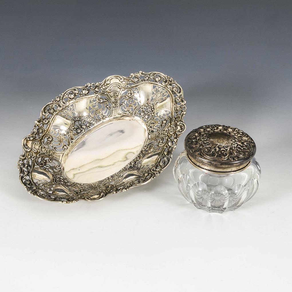 Openwork bowl with rose and rocaille reliefs (25 x 18 cm, 227 g). / Round glass jar with sterling silver lid in relief (H 9 cm, Ø 10.5 cm, 42 g).