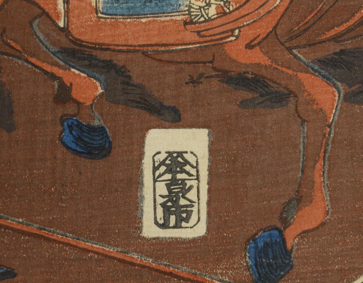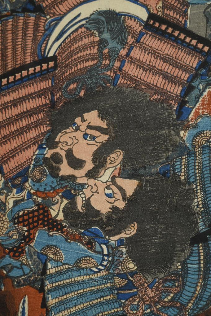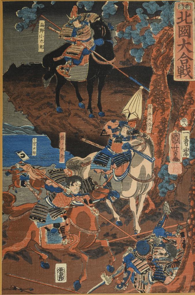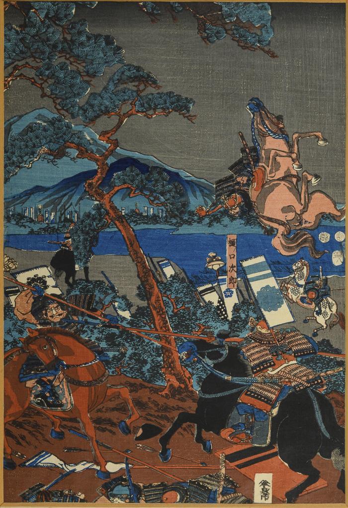 Three sheets belonging together, forming a fierce battle scene of many samurai on horseback. Partly with explanatory characters.