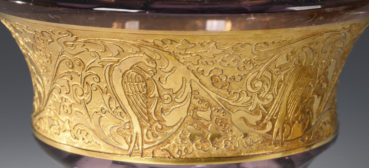 1x vase of violet glass with peel cut and floral oroplastic decoration with birds (h 13.5 cm). / 1x conical, faceted vase and figurative oroplastic decoration (H 11 cm).