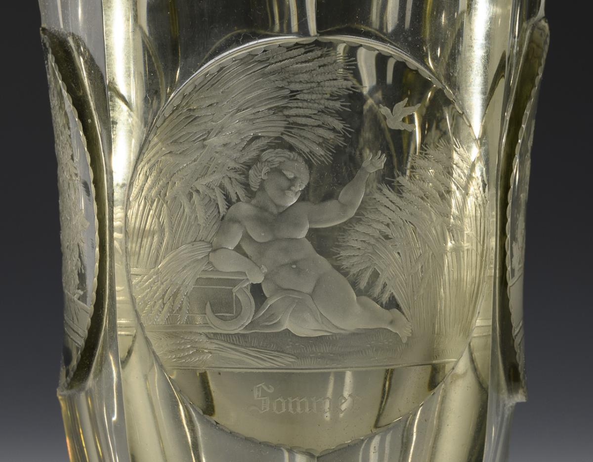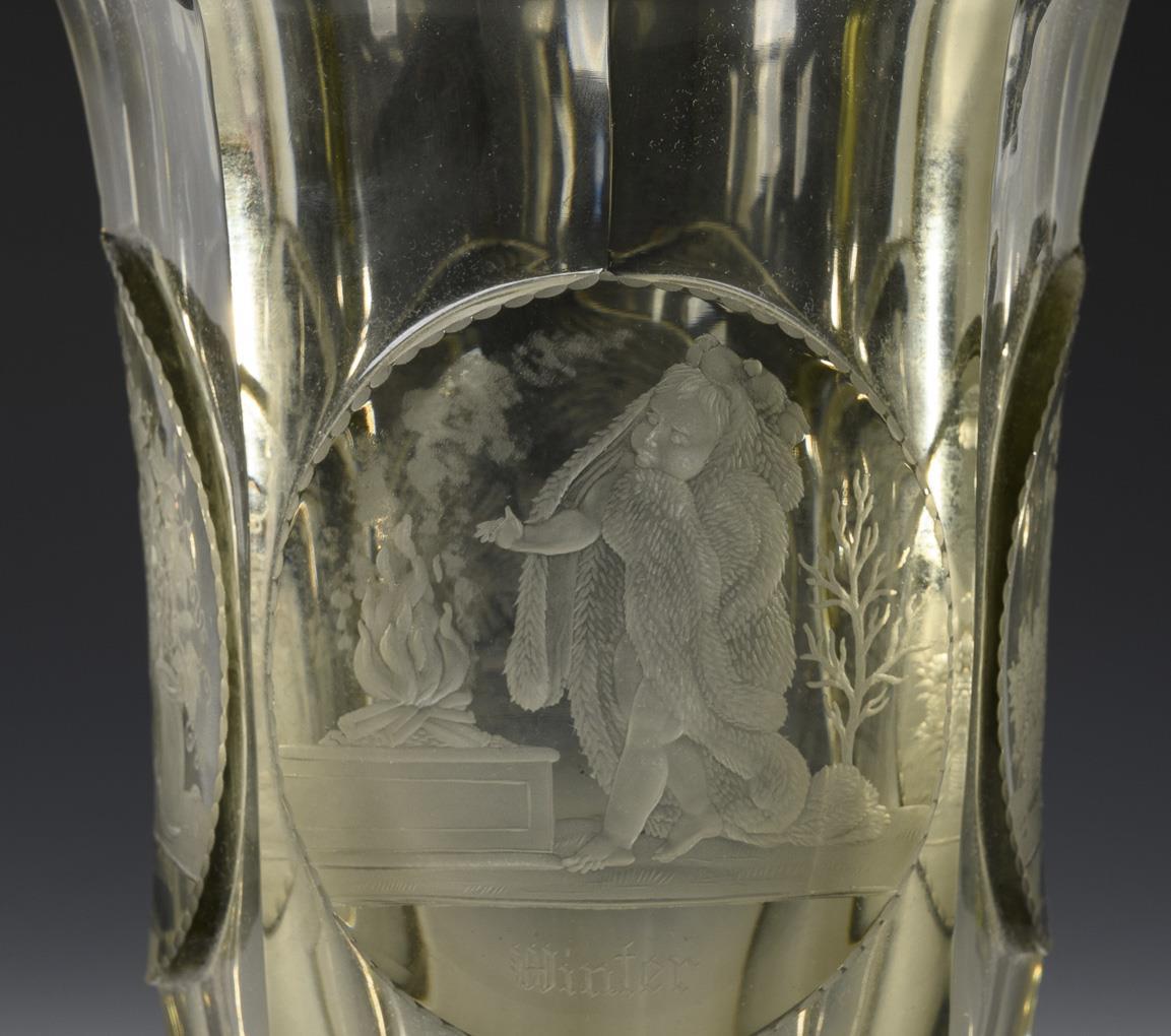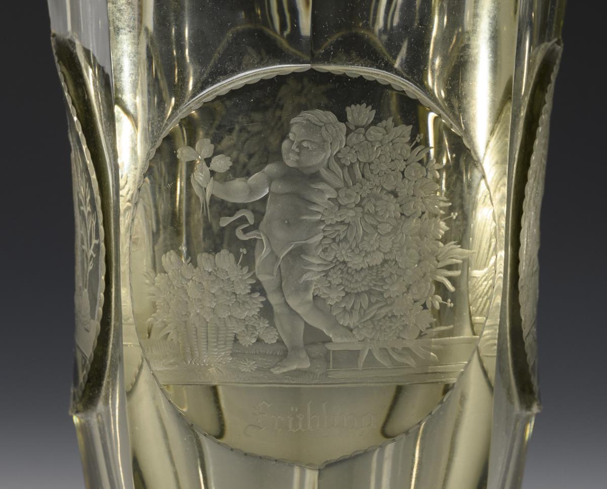 Tall, multi-faceted crater vase made of smoked glass. On the wall four highly cut medallions with engraved allegorical depictions of the seasons.