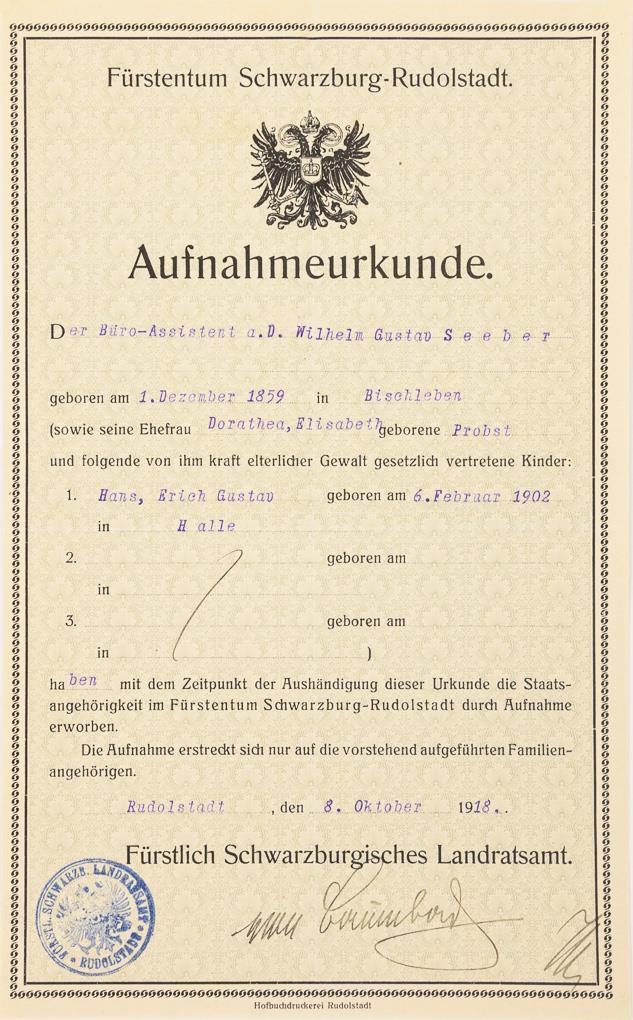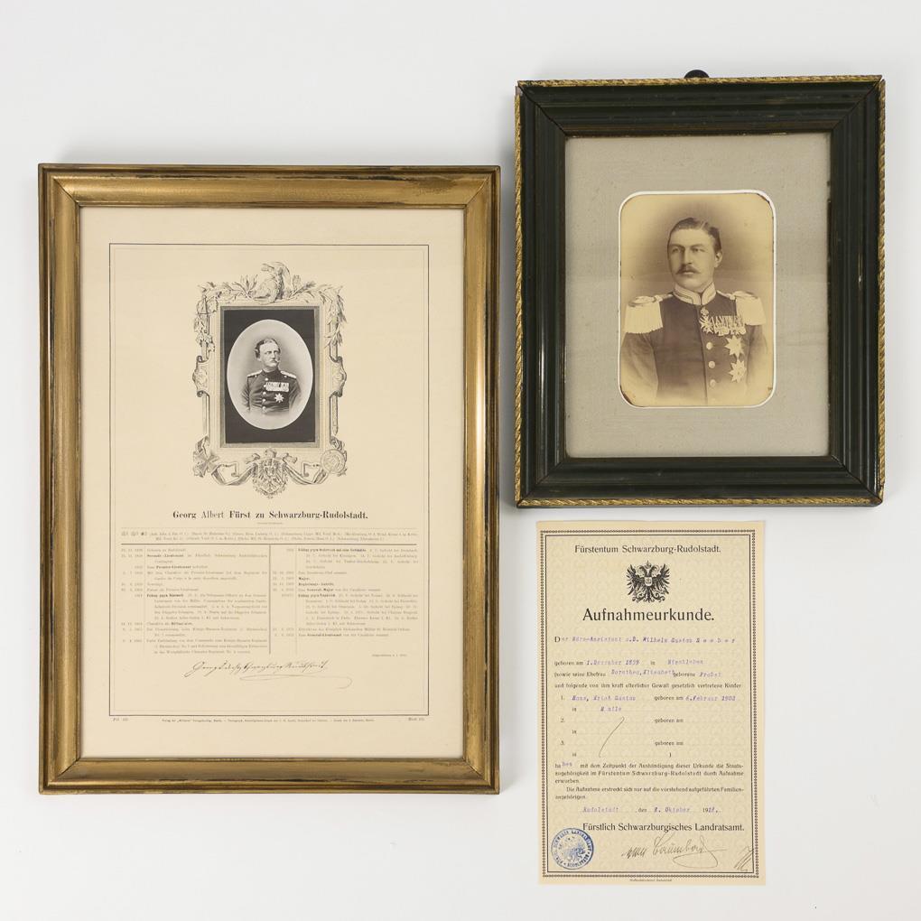In glazed gold border a printed photo of Georg Albert Prince of Schwarzburg-Rudolstadt as well as a list of his military career / certificate of admission to citizenship of the Principality of Schwarzburg-Rudolstadt from 1918 / In the glazed frame a large photo of Prince Günther (1852 - 1925) in uniform. There are traces of glue to the edge of the photo, some losses to the frame.