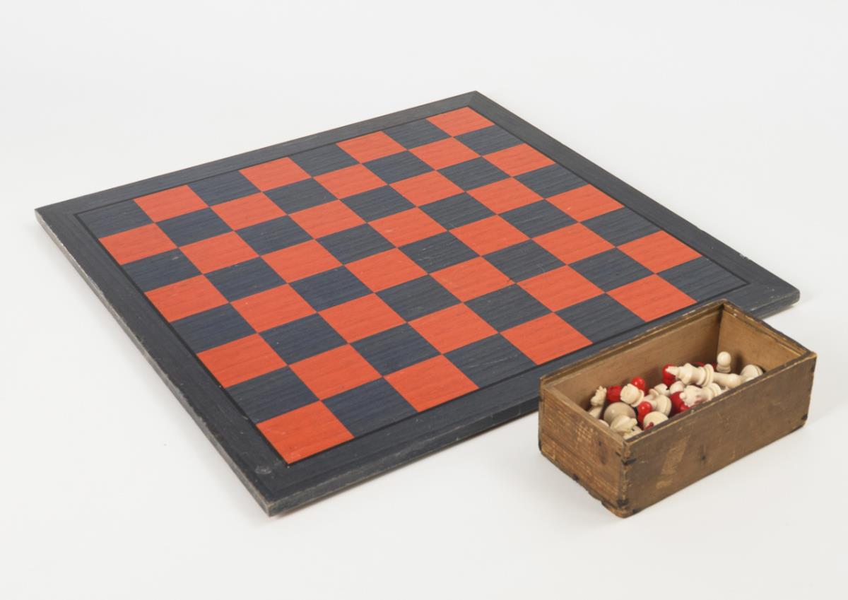 Complete chess set in an old box. Board in red and dark blue and with blue border. Casket without lid, minimal scratches on the board, box with signs of age/use and without lid.
