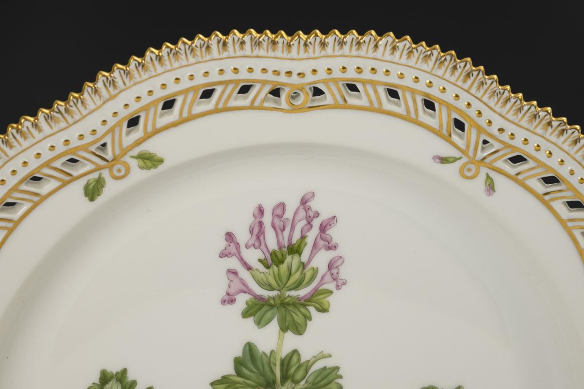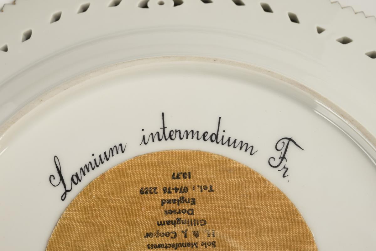 Plate with pierced rim and multi-pass, serrated edge. The mirror depicts a dew nettle, inscribed in Latin on the underside.