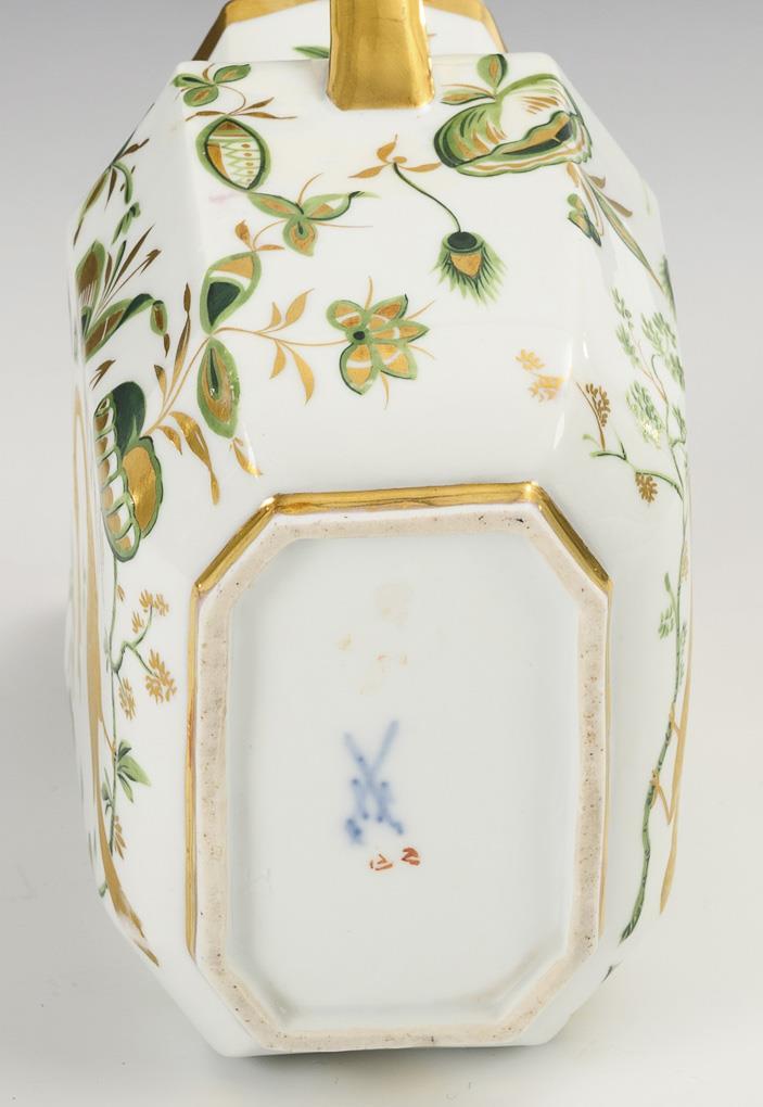 Rectangular shape with cut corners, high curved handle, wide bowl. Painted in green camaieu and etched gold with the decoration "Bird decoration with insect and squirrel". Minimal gold abrasion.