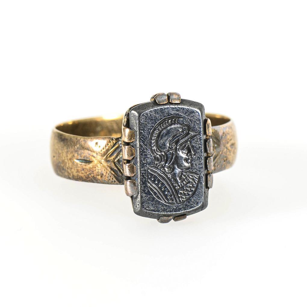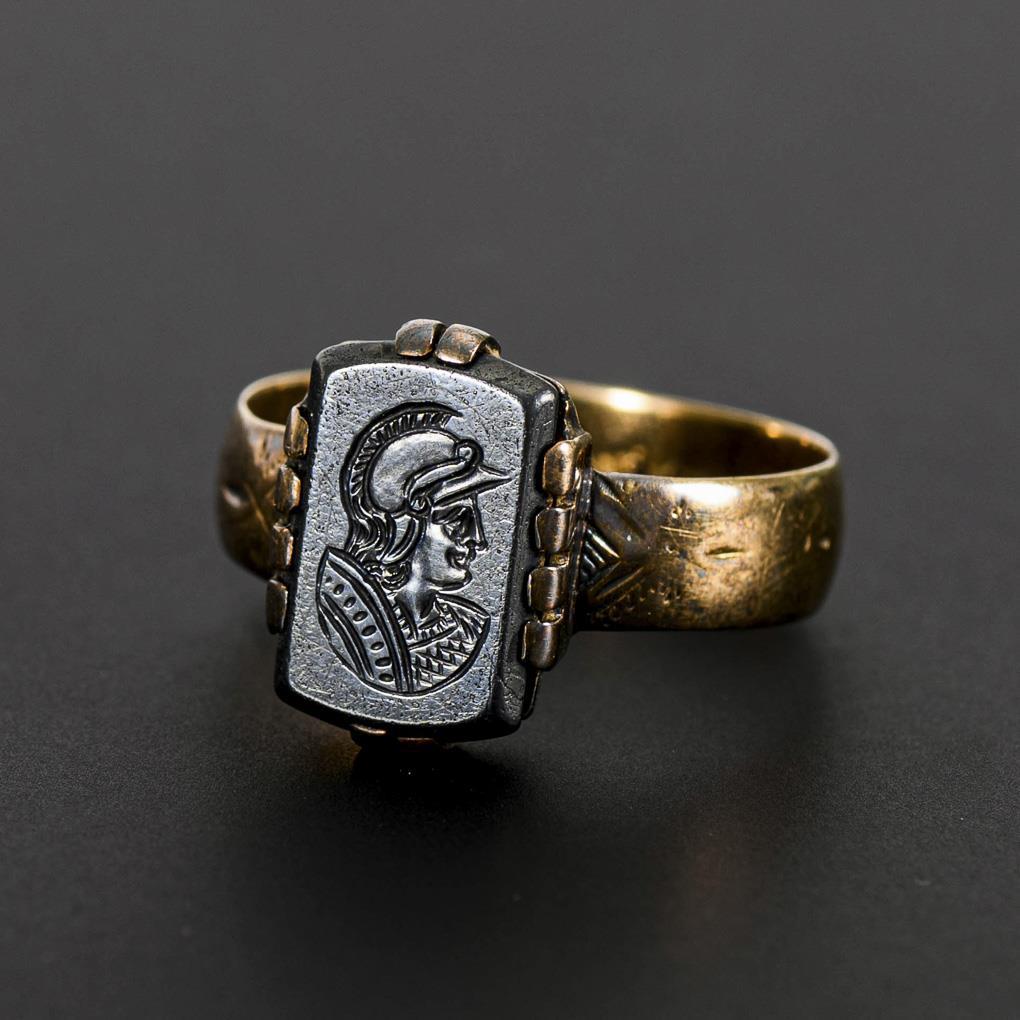 Bezel-set stone with antique-style cut warrior profile head, between broad rail.