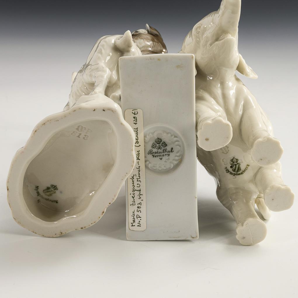 2x NYMPHENBURG: Ibex on a rock pedestal, model no. 813, design 1936, (H 19 cm) and young elephant, model no. 877, design 1940 (H 9 cm), both design by August Göhring (1891-1965)/ 1x ROSENTHAL, model no. 583, design by Willi Münch-Khe (1885-1960): donkey foal (H 15 cm). Hair and fire cracks under 3 hooves of the donkey.