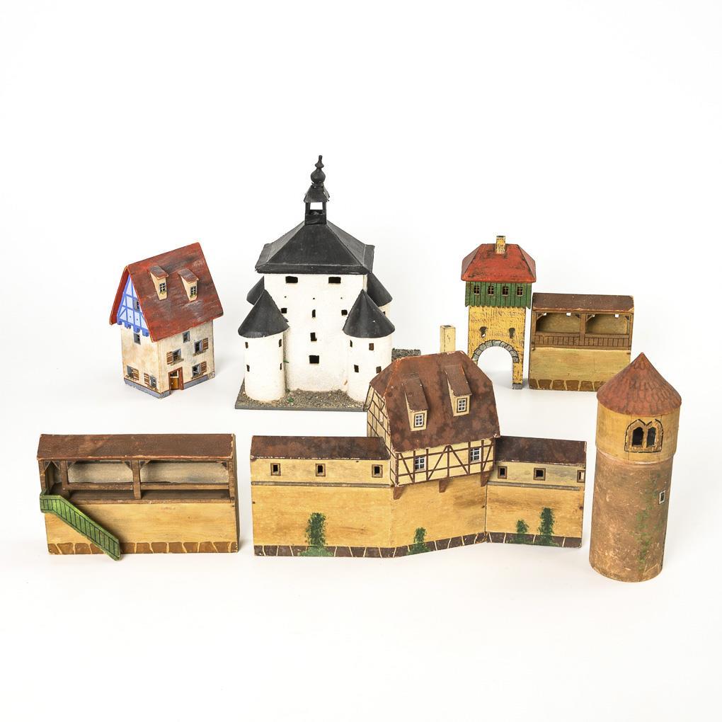 White castle with 4 corner turrets, half-timbered house with town wall, 2 town wall elements, town gate, round tower and half-timbered house "Gasthof zur Krone". In oval box, 20 x 46 x 31.5 cm. Signs of age, small defects.