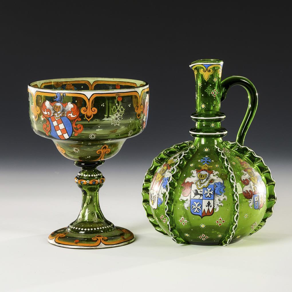 1x bottle with spherical body, narrow neck and six fused, pinched bands (h 19.5 cm). / 1x footed bowl with bell-shaped bowl, nodded shaft and round foot (h 17 cm). Both with depictions of coats of arms on all sides.