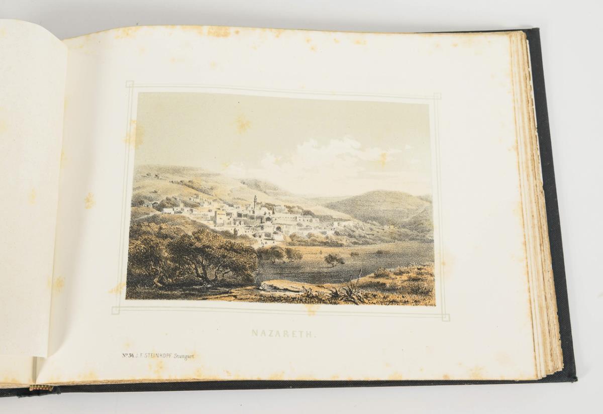 50 selected original views of biblically important places faithfully drawn from nature by J.M. Bernatz. With texts by G.H. v: Schubert and J. Roth. 2nd impression. In gilt-stamped cloth binding. Block foxed.