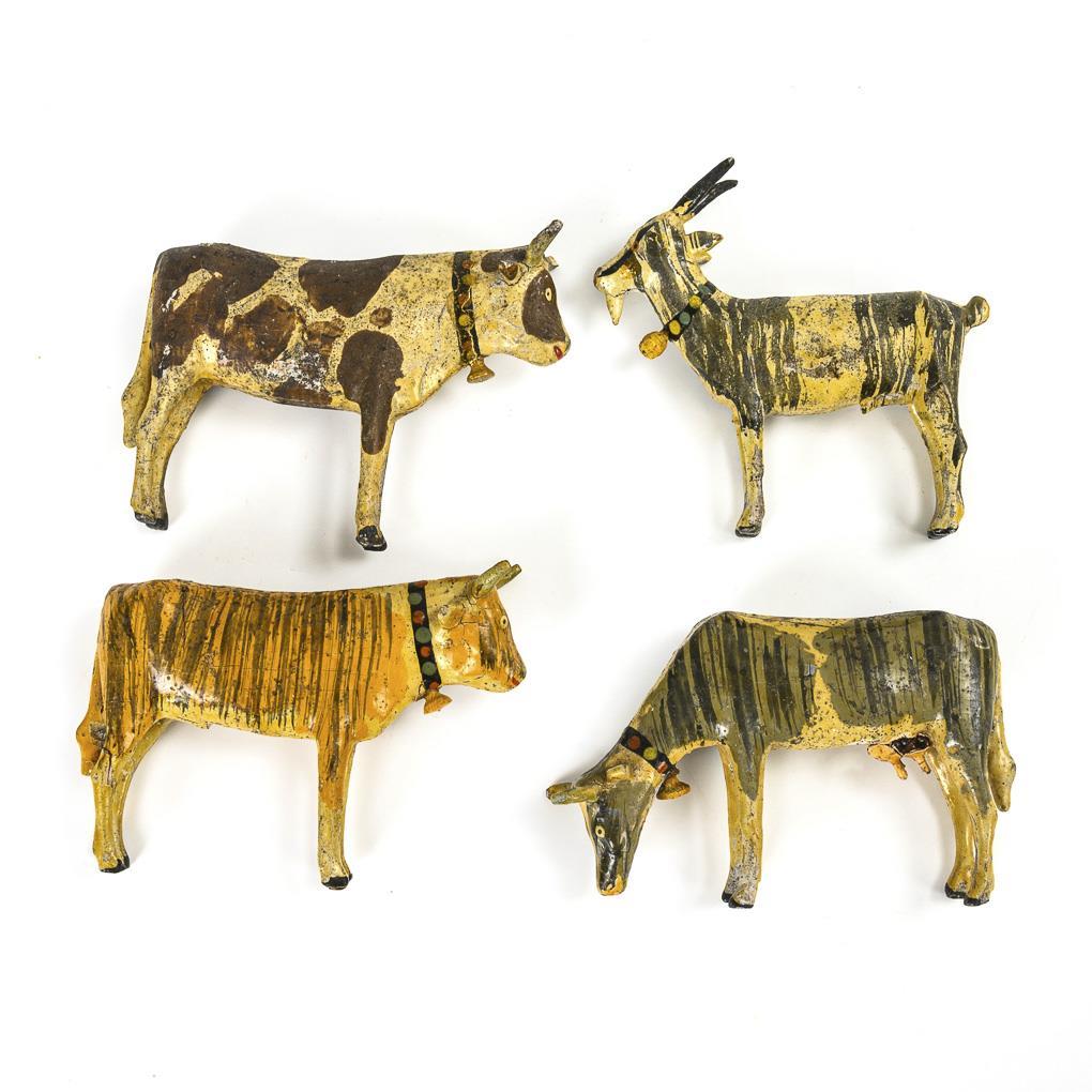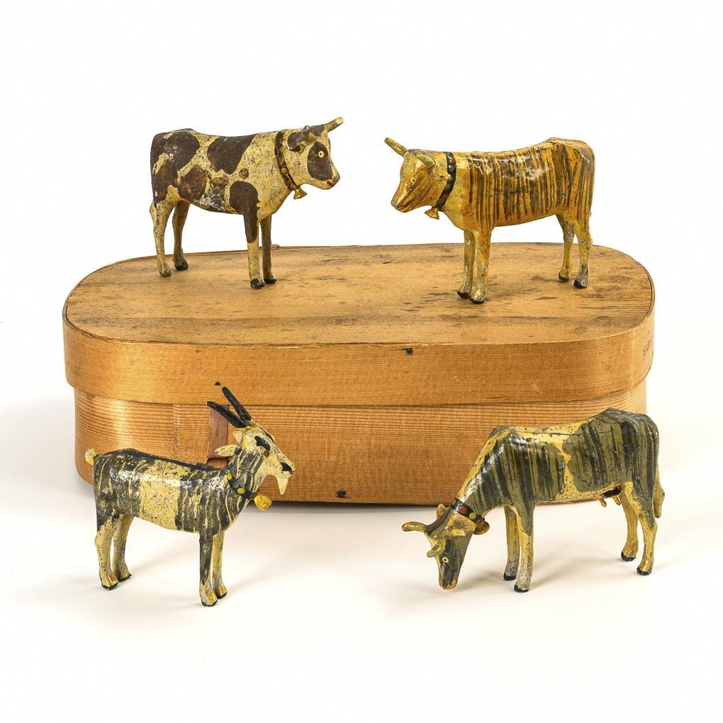 High-quality crafted animals: 3 cows and a goat. In old chip box. Small defects and glue spots.