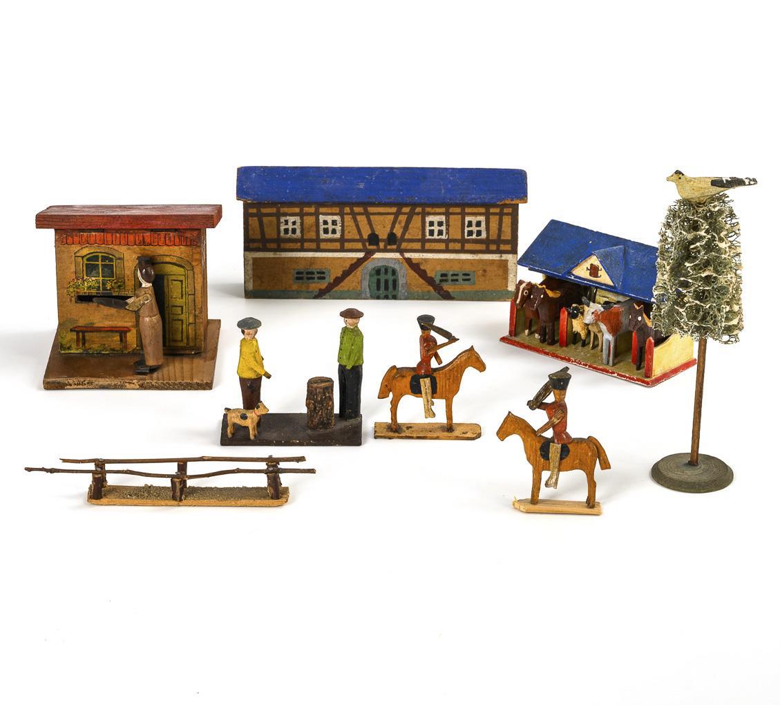 Half-timbered house, stable with 6 hooped animals, money box in the shape of a little house, 2 wood choppers, 2 soldiers on horseback (in the style of Gustav Ehnert), loofah with bird and 1 footbridge. Parts with small defects.