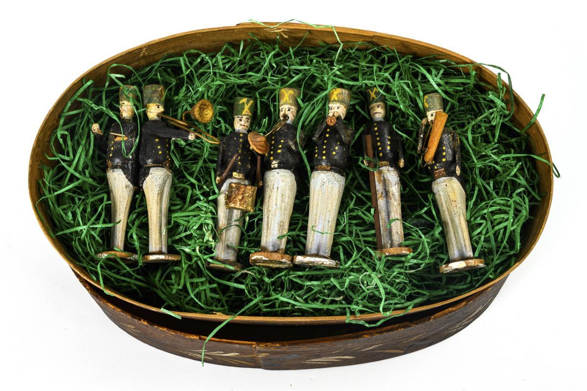 7 musicians in traditional Erzgebirge costume. H 9 cm each. In oval chipboard box with "I H S" (Iesus Hominum Salvator) on the lid. 7 x 26 x 16 cm. Signs of age, some small defects.