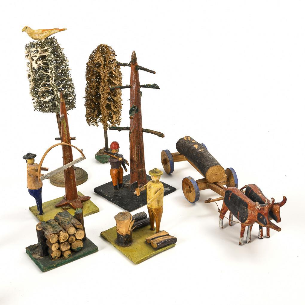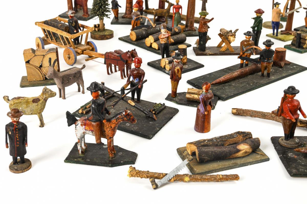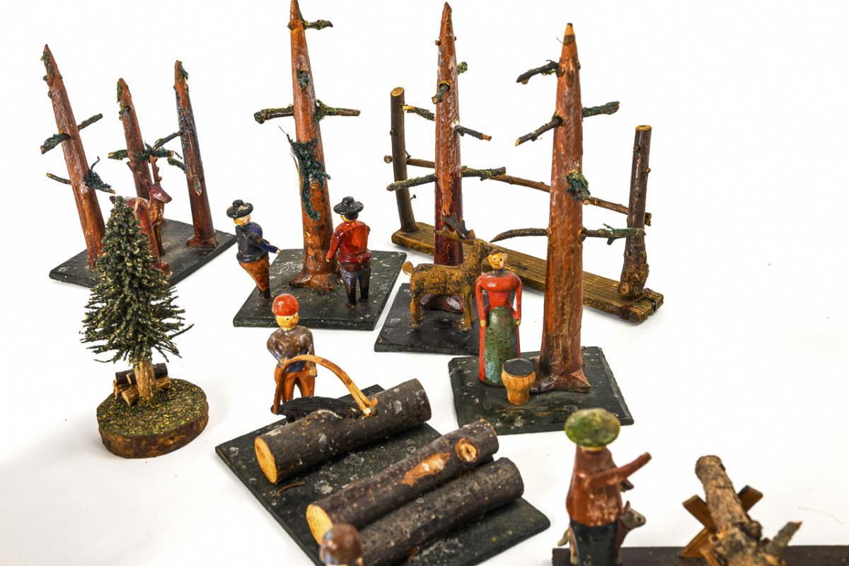 30-piece woodland set with trees, figures harvesting wood, 2 wood piles, a team of oxen and a team of wagons, 3 trees, animal figures etc.. In large box (Ø 37.5 cm). Slight signs of age, minor defects.