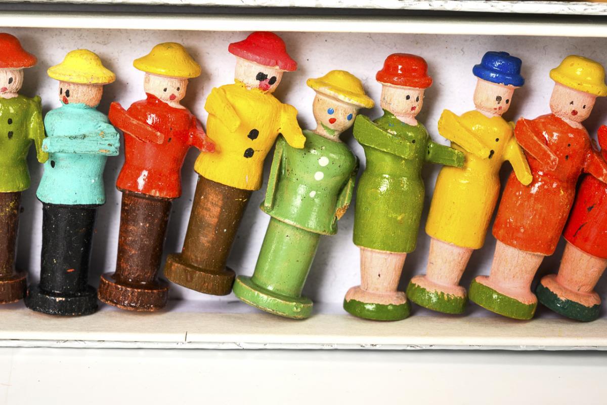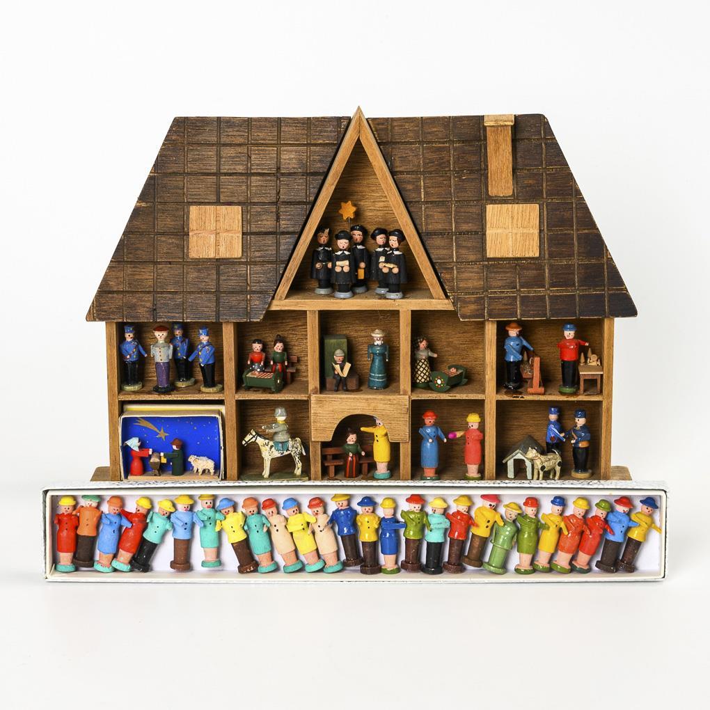 Setting box in the shape of a show house with open gable and 10 little rooms. Furnished with various figural scenes. 20 x 28 x 4 cm. With approx. 26 small individual figures. H 3.5 cm each. Some slight signs of age.