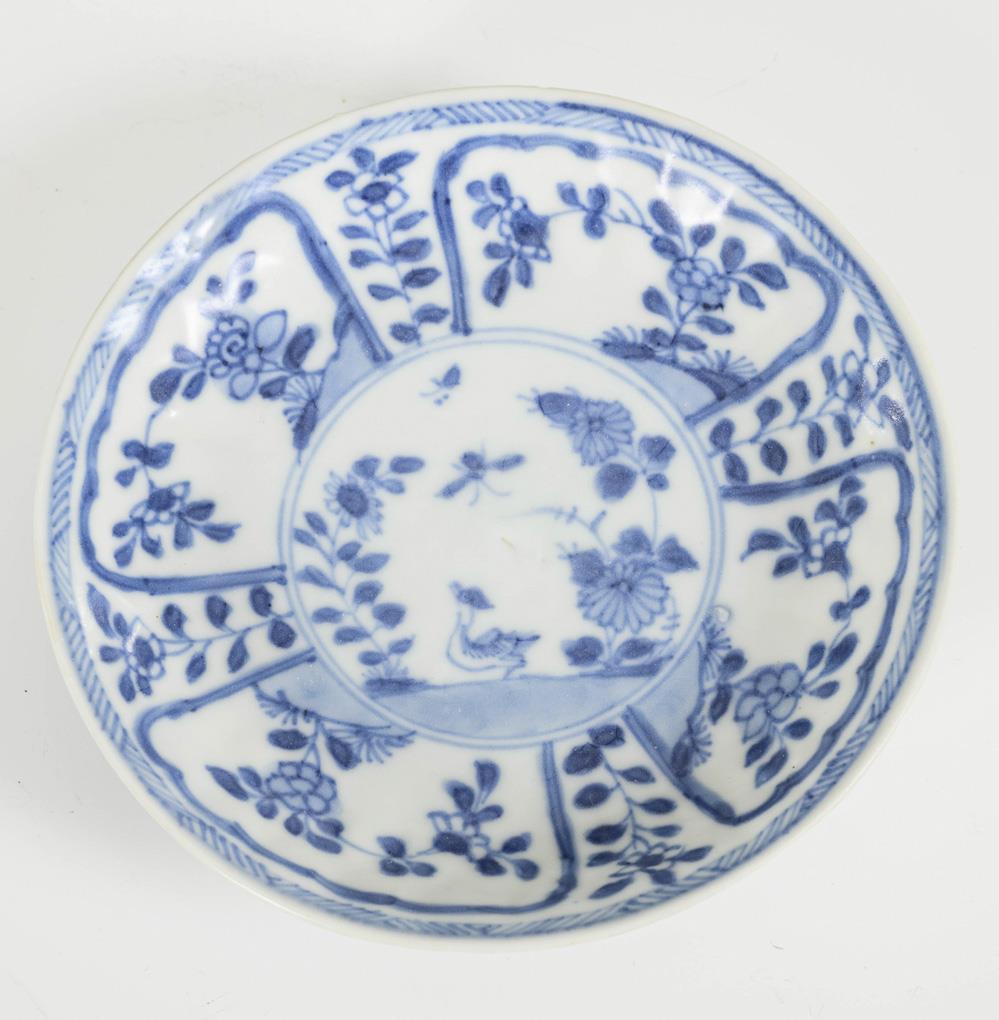 Also known as Batavia porcelain. Both in underglaze blue painting. Small landscape with single figure in the mirror, brown glazed underside / Bird and insects among flowers, slightly ribbed rim.