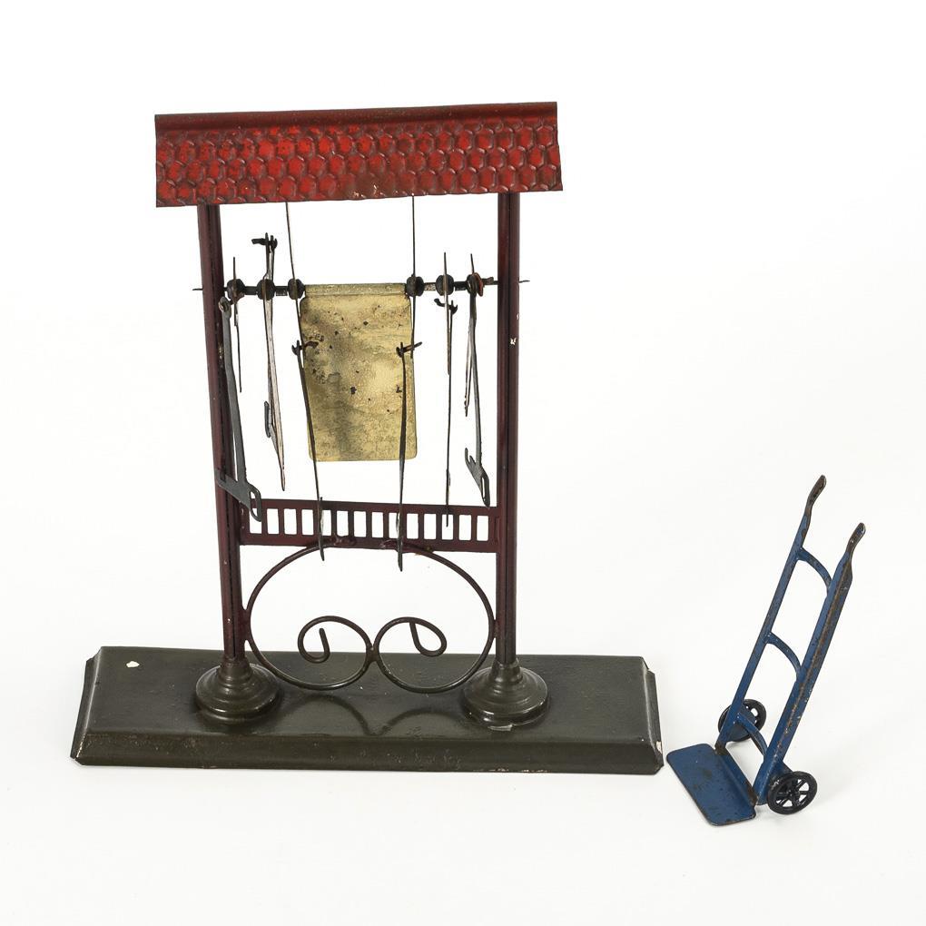Gauge 1. direction indicator probably Karl Bub, marked: "Germany". 21 x 18 x 5.5 cm. Blue Märklin handcart, marked. 9.5 x 4.5 x 3.5 cm. Small paint defects.