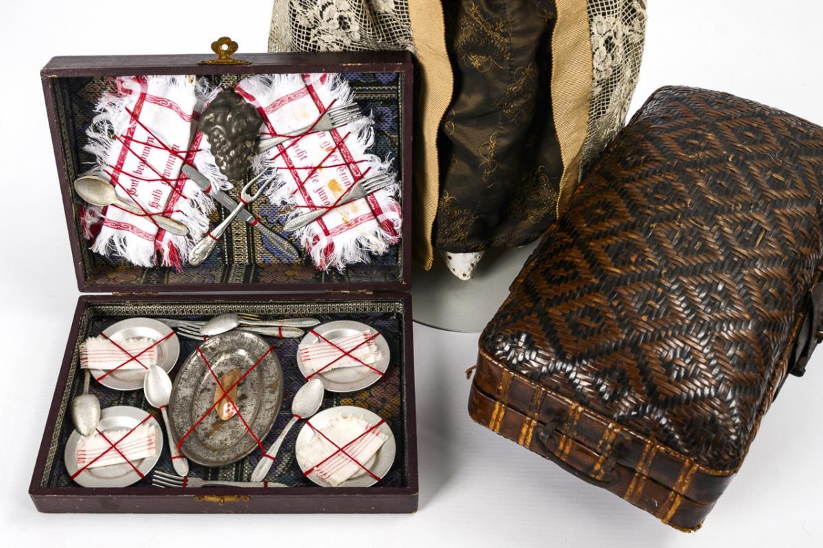 Chest puppet Armand Marseille, wicker suitcase and picnic case.