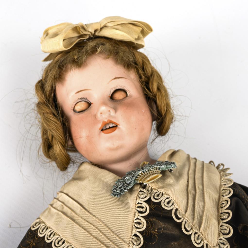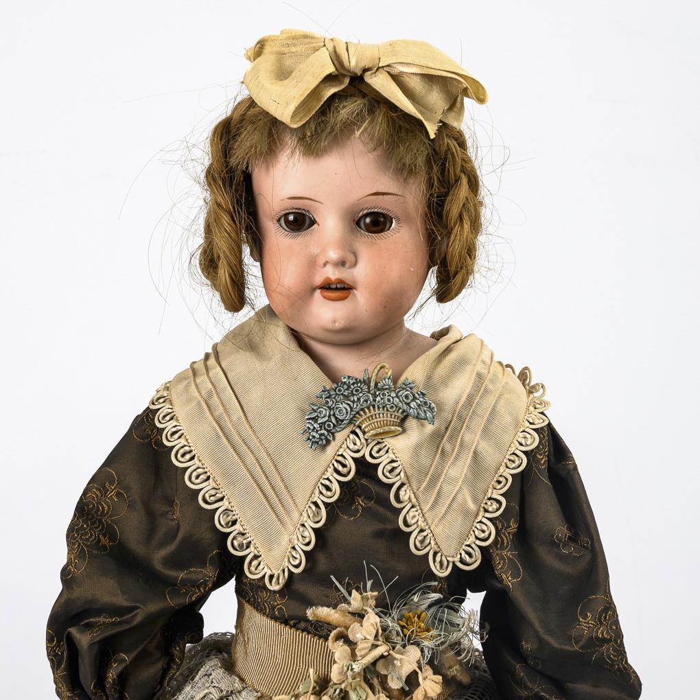 Doll (AM 370) with bisque head, brown sleeping eyes, blond real hair wig, slim leather body and celluloid arms with mass hands. Brown dress in old style. L 50 cm. Comes with a woven suitcase with iron fittings (12.5 x 28 x 17 cm) and a flat casket with stapled tinplate and aluminum dishes (5 x 22 x 15 cm). Head not x-rayed: no visible defects, arms repaired. Case with signs of age and defects.