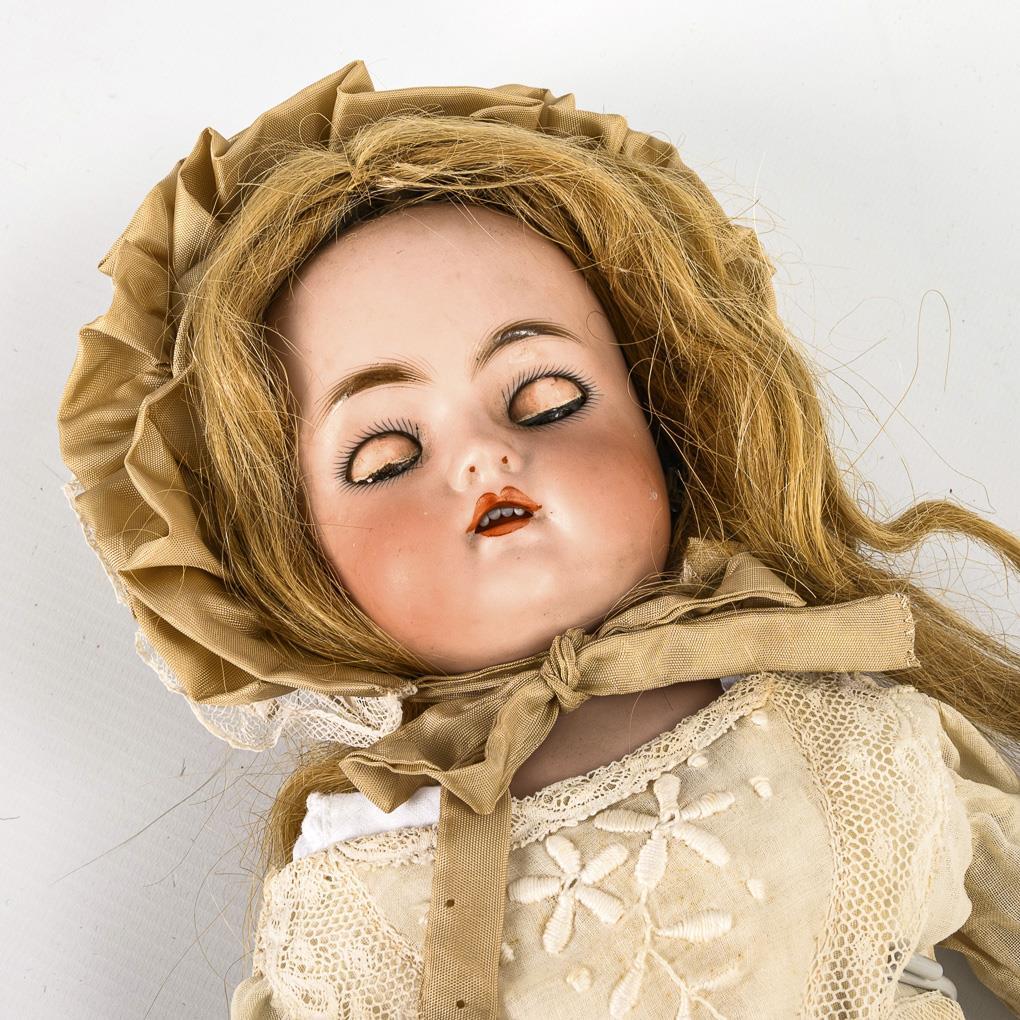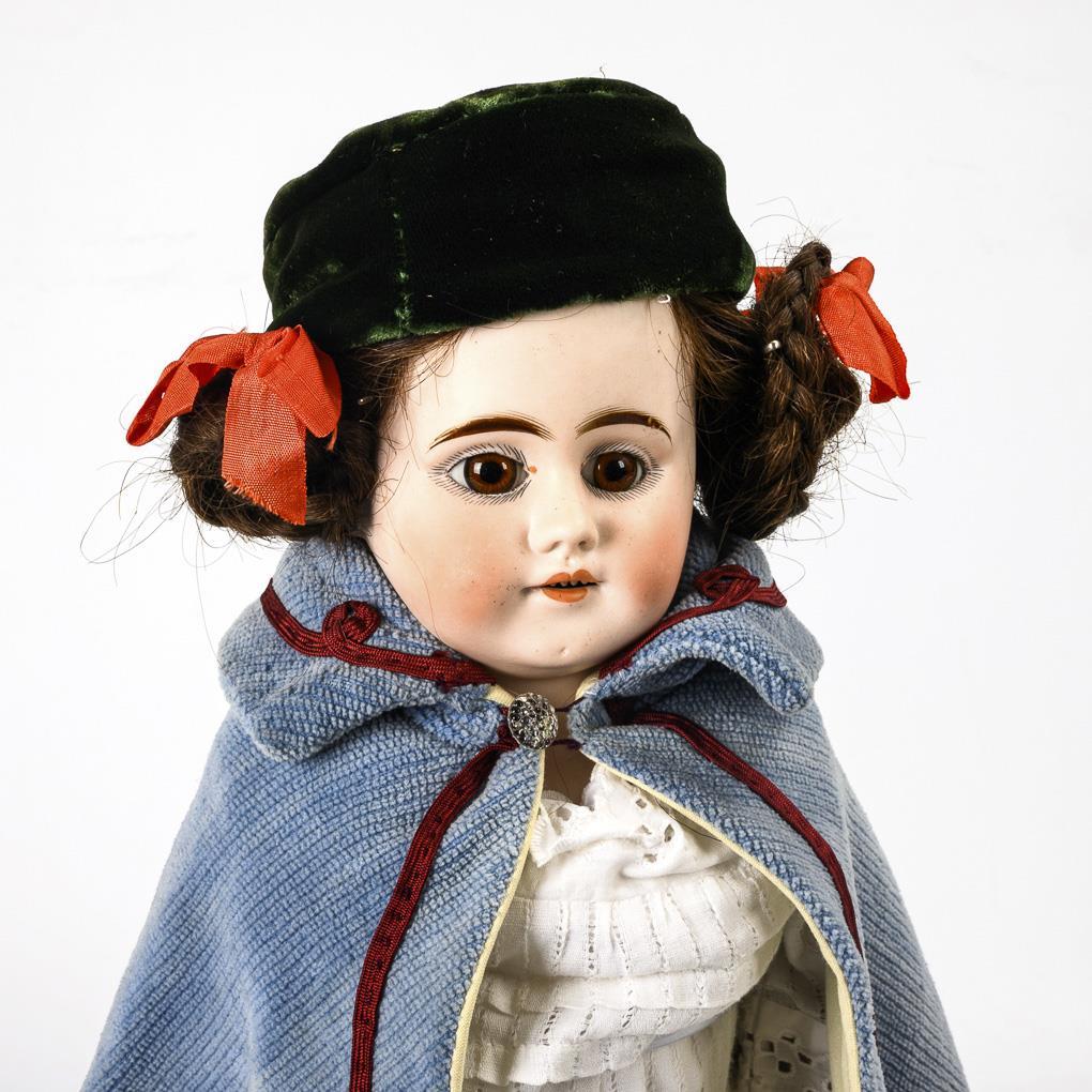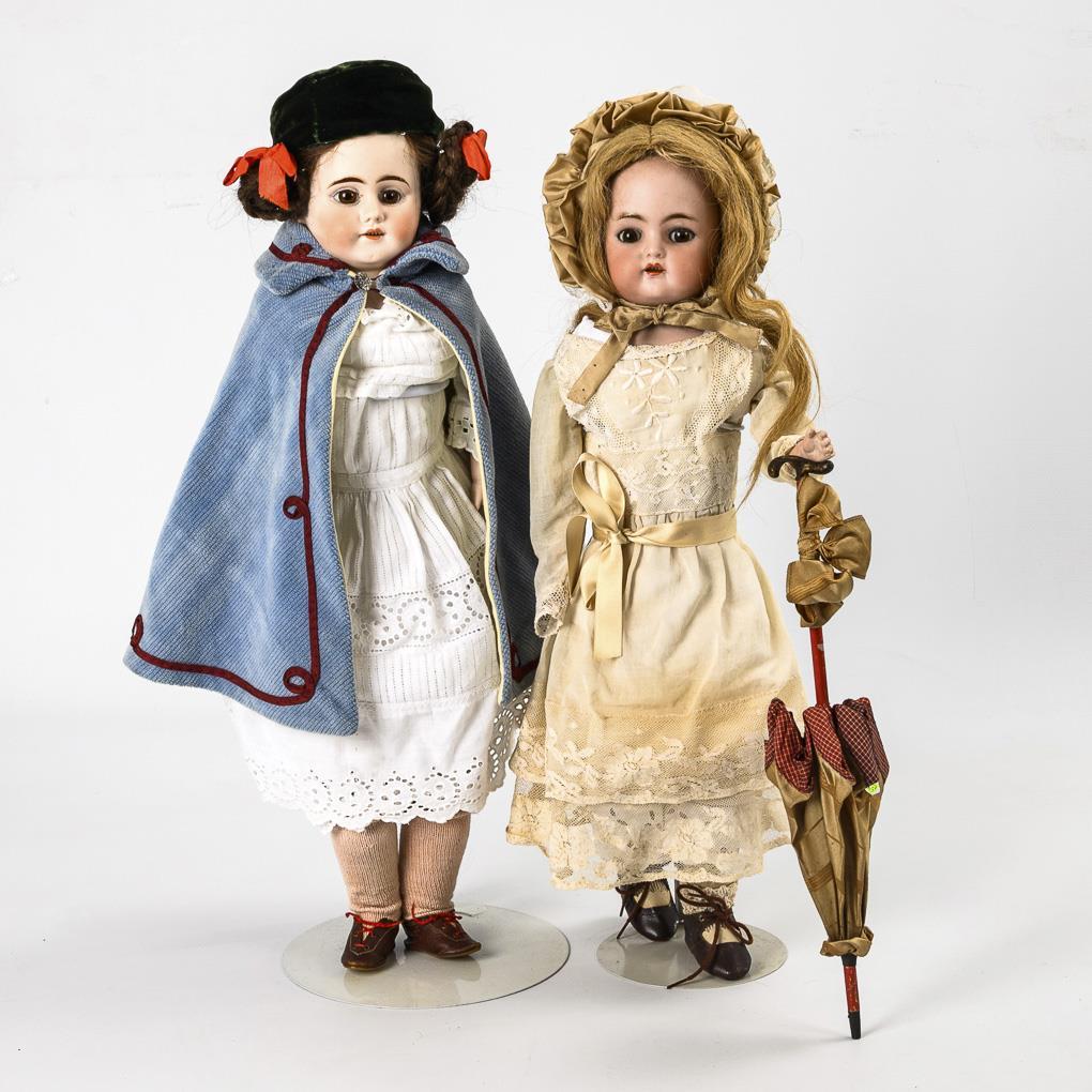 Both with chest head, real hair wig, slim leather body, bisque forearms, light-colored dress and brown shoes. Blonde doll Simon & Halbig (S & H/ K & R marked) with brown sleeping eyes, earrings, cream-colored dress, hood and umbrella / doll with head mark "8", snail hairstyle, fixed brown eyes, white dress, blue cape and green velvet cap. Heads not x-rayed: no defects visible. 1 finger defective in each case.