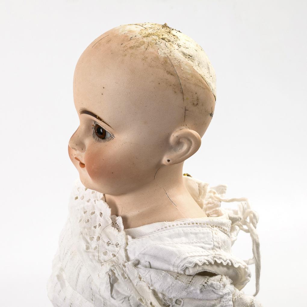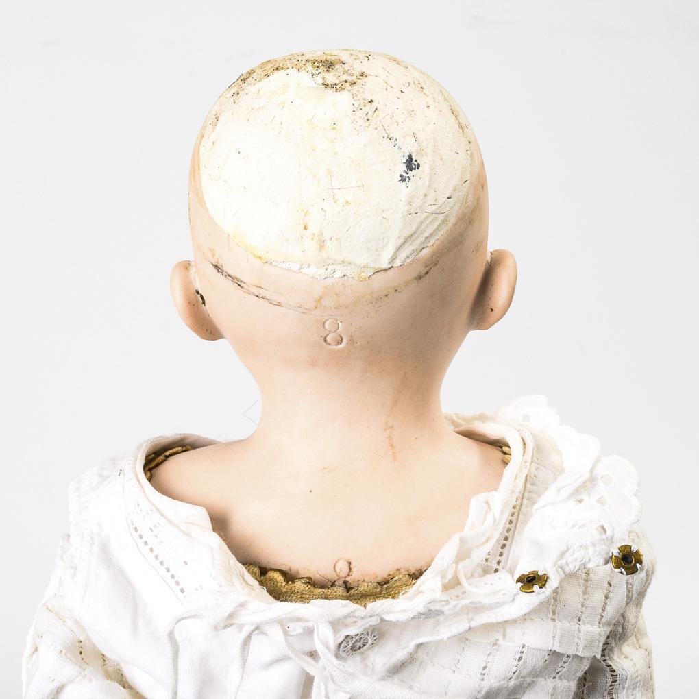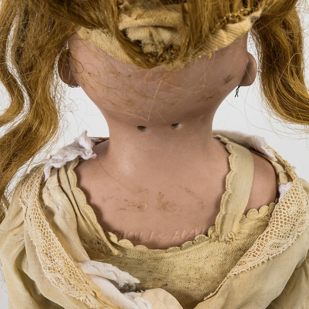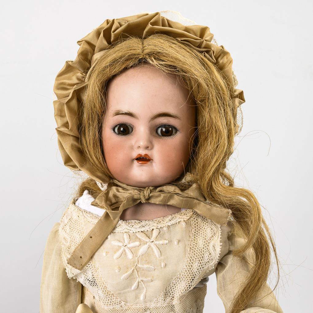 Both with chest head, real hair wig, slim leather body, bisque forearms, light-colored dress and brown shoes. Blonde doll Simon & Halbig (S & H/ K & R marked) with brown sleeping eyes, earrings, cream-colored dress, hood and umbrella / doll with head mark "8", snail hairstyle, fixed brown eyes, white dress, blue cape and green velvet cap. Heads not x-rayed: no defects visible. 1 finger defective in each case.