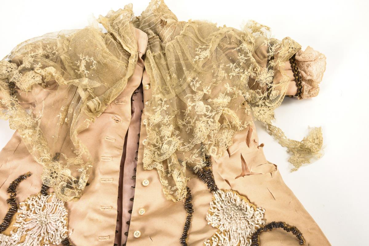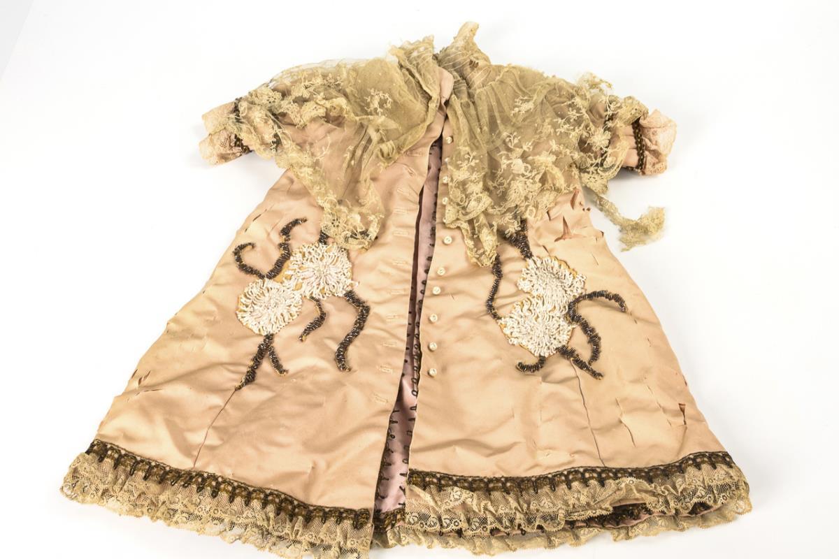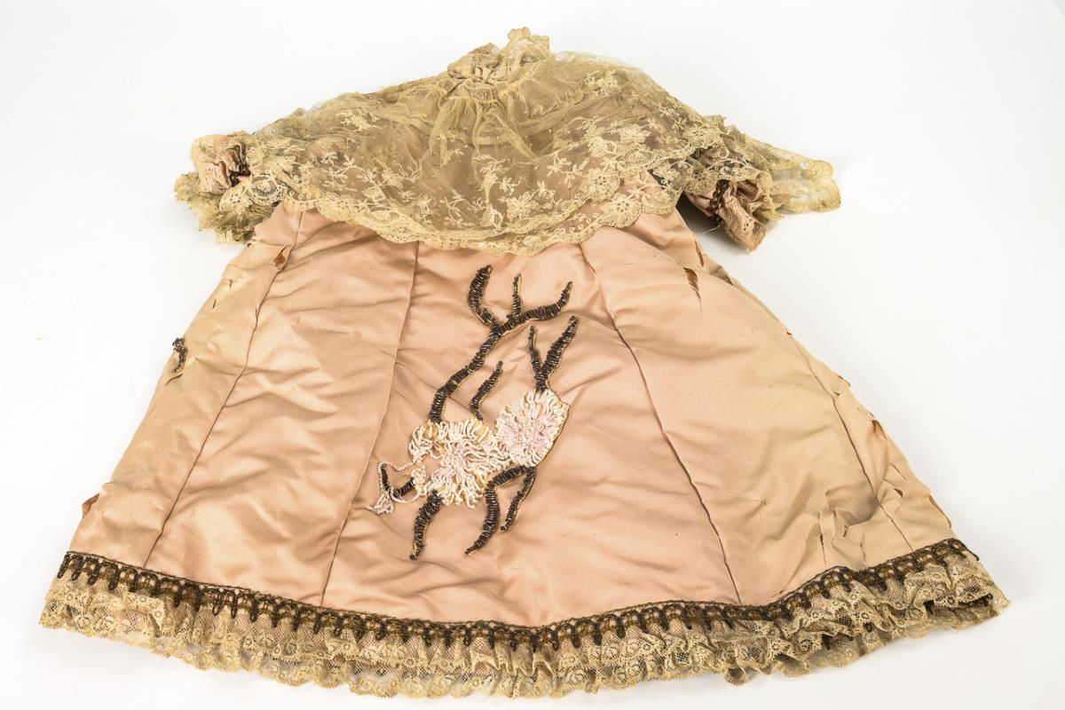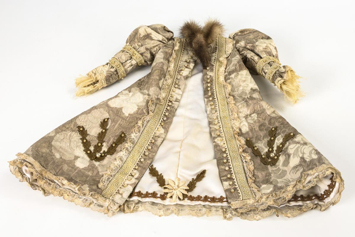 Bust on adjustable lathe stand. Signs of age, broken threaded knob. H 72 cm. / 3 elaborately sewn doll's coats with appliqués, pearl, sequin and fur trimmings. Fabric partly somewhat torn.