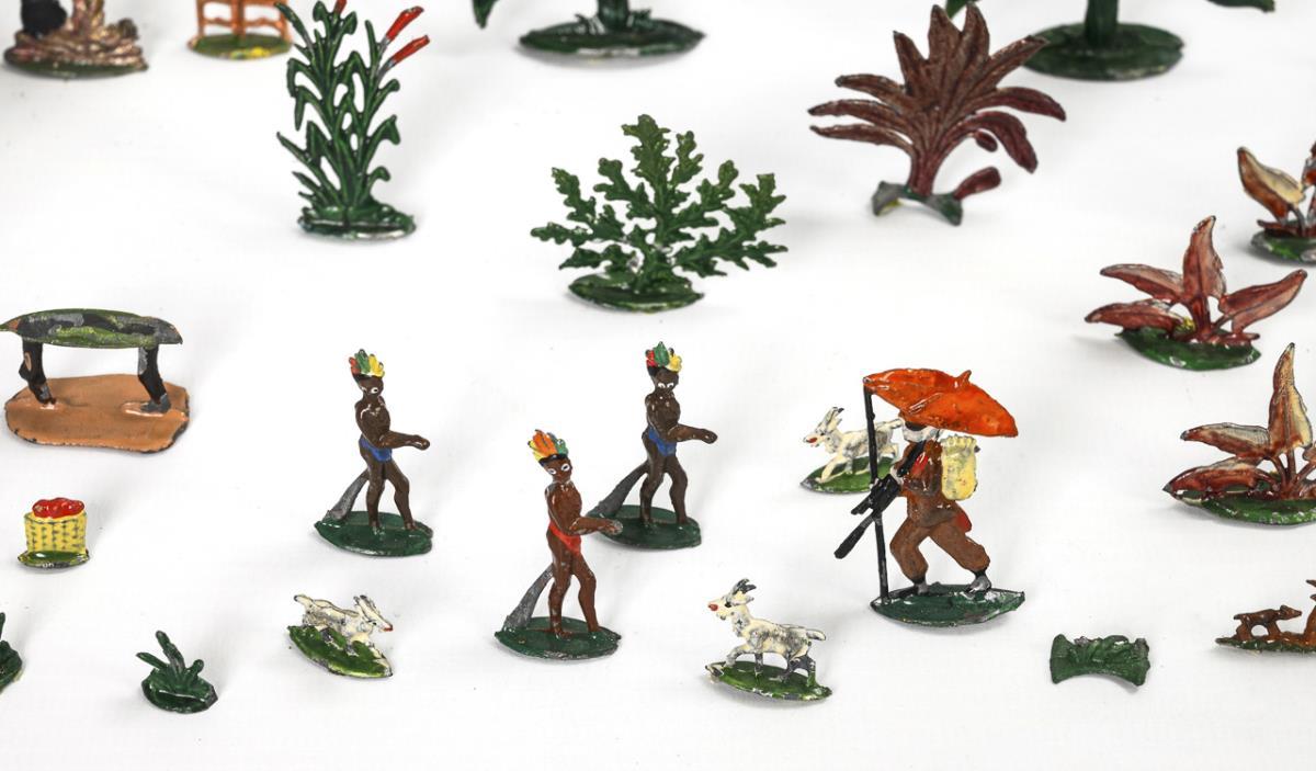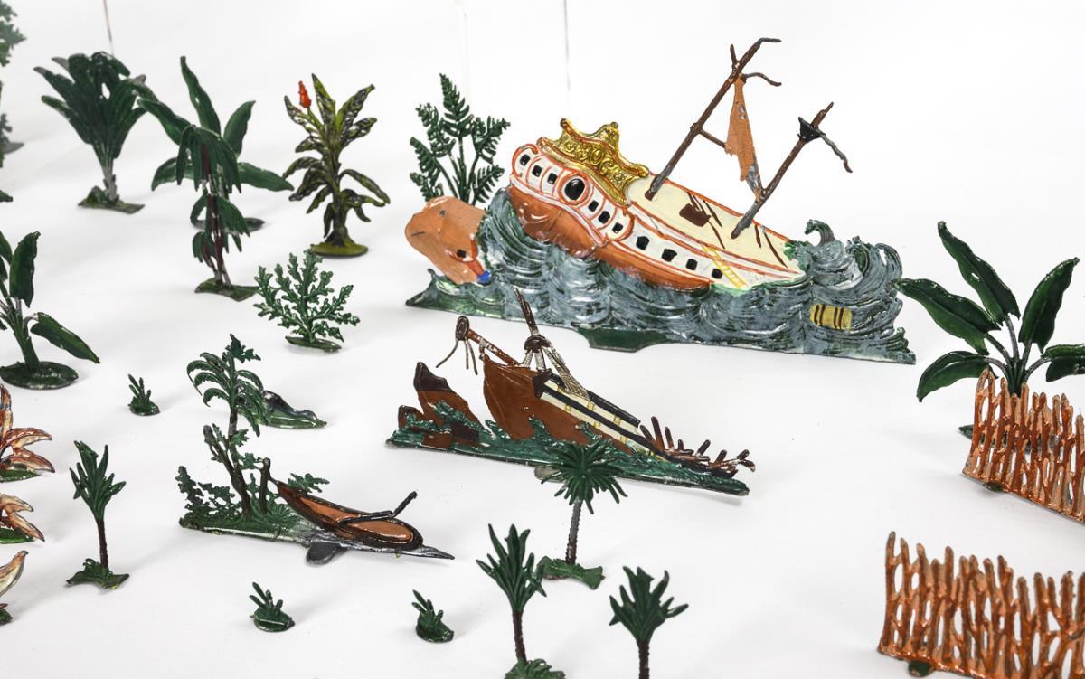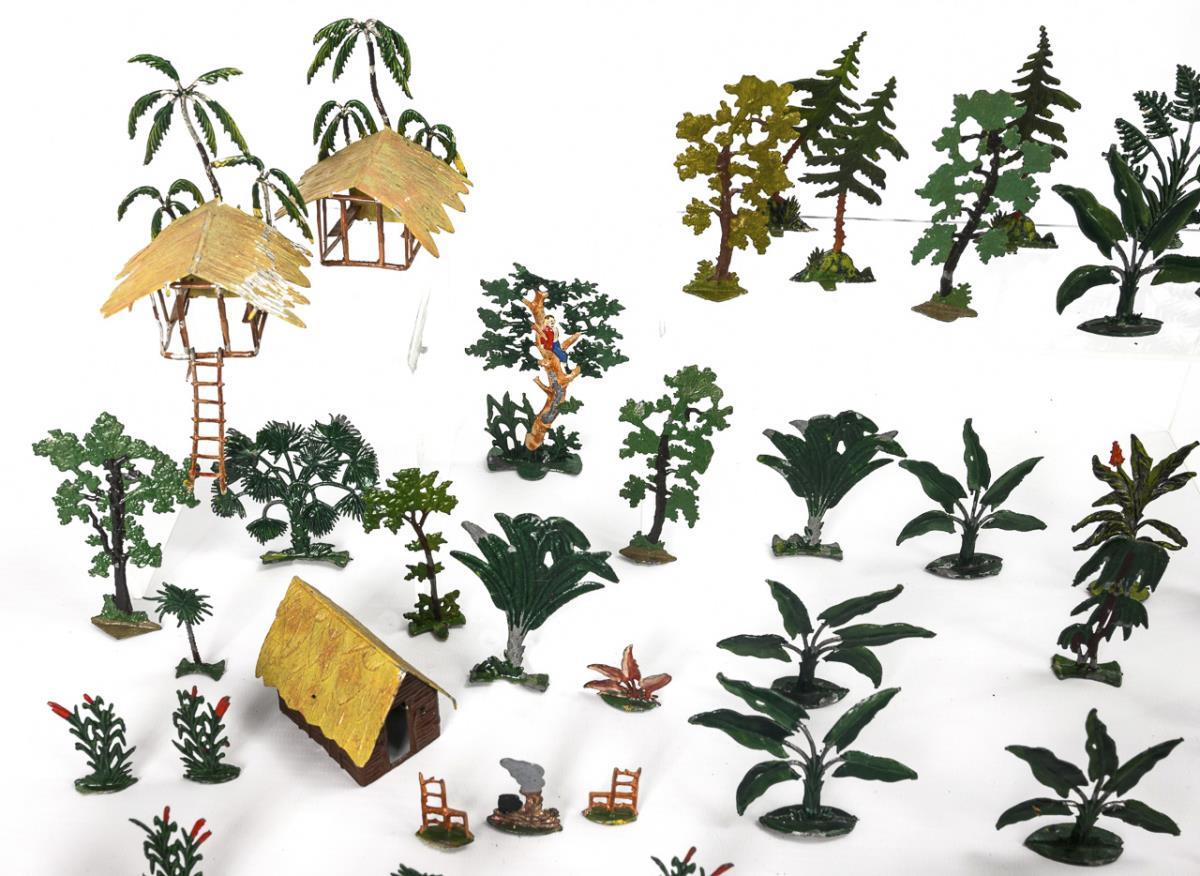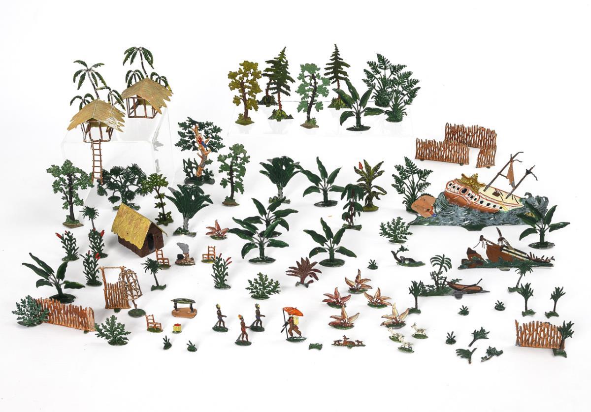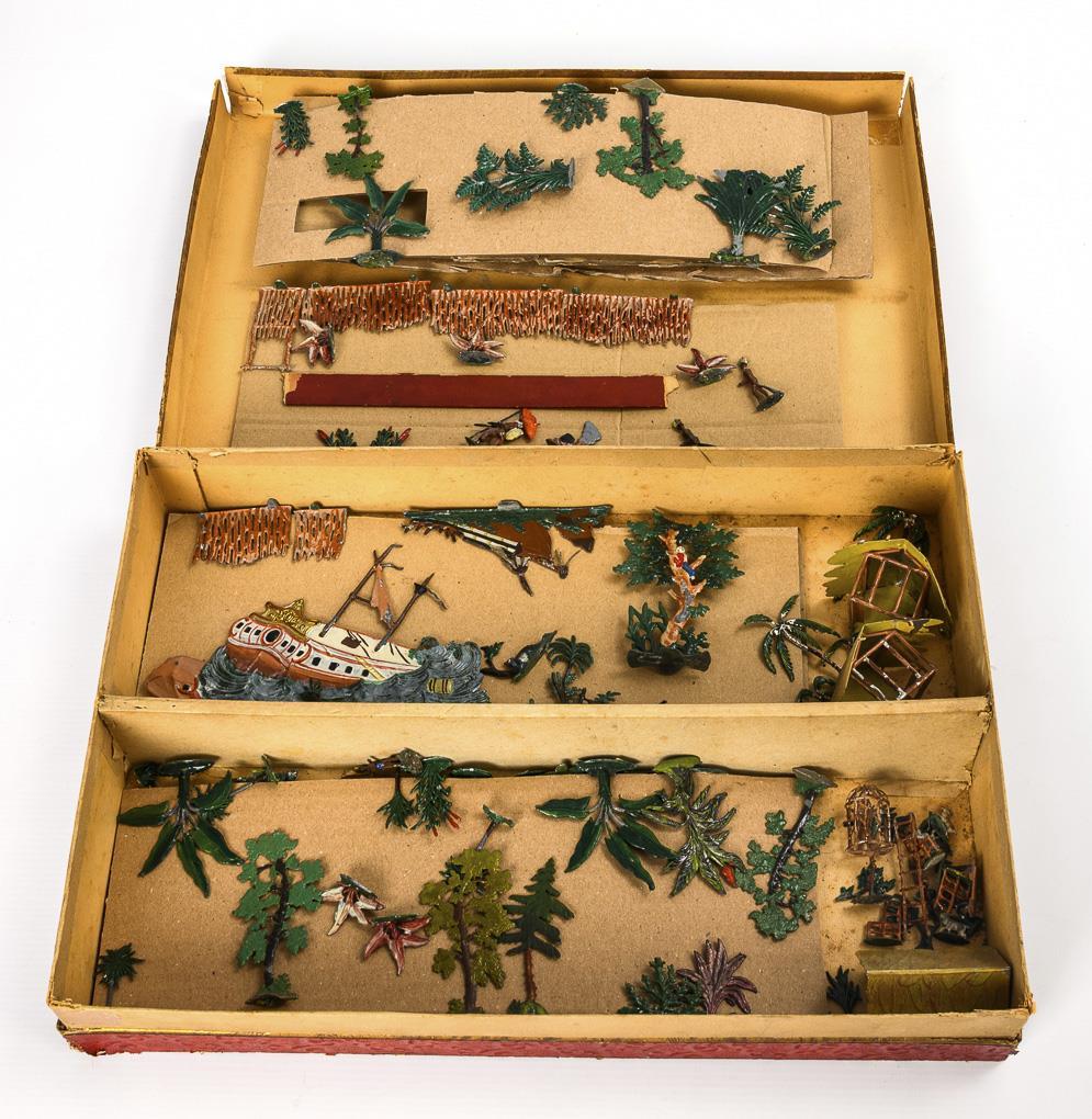 Robinson Crusoe pewter figure set in original box. Including sinking ship, 2 huts, numerous trees and plants, Robinson, 3 islanders etc. H 1.5 - 9.5 cm. Some trees probably added.