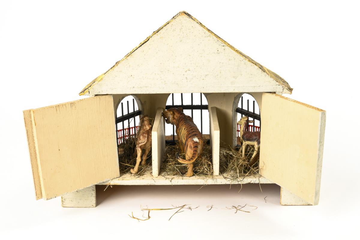Semi-circular stable building with 3 small, barred animal boxes. Including 2 mass animals (tiger and gazelle) and 1 younger camel made of plastic. Small defects.