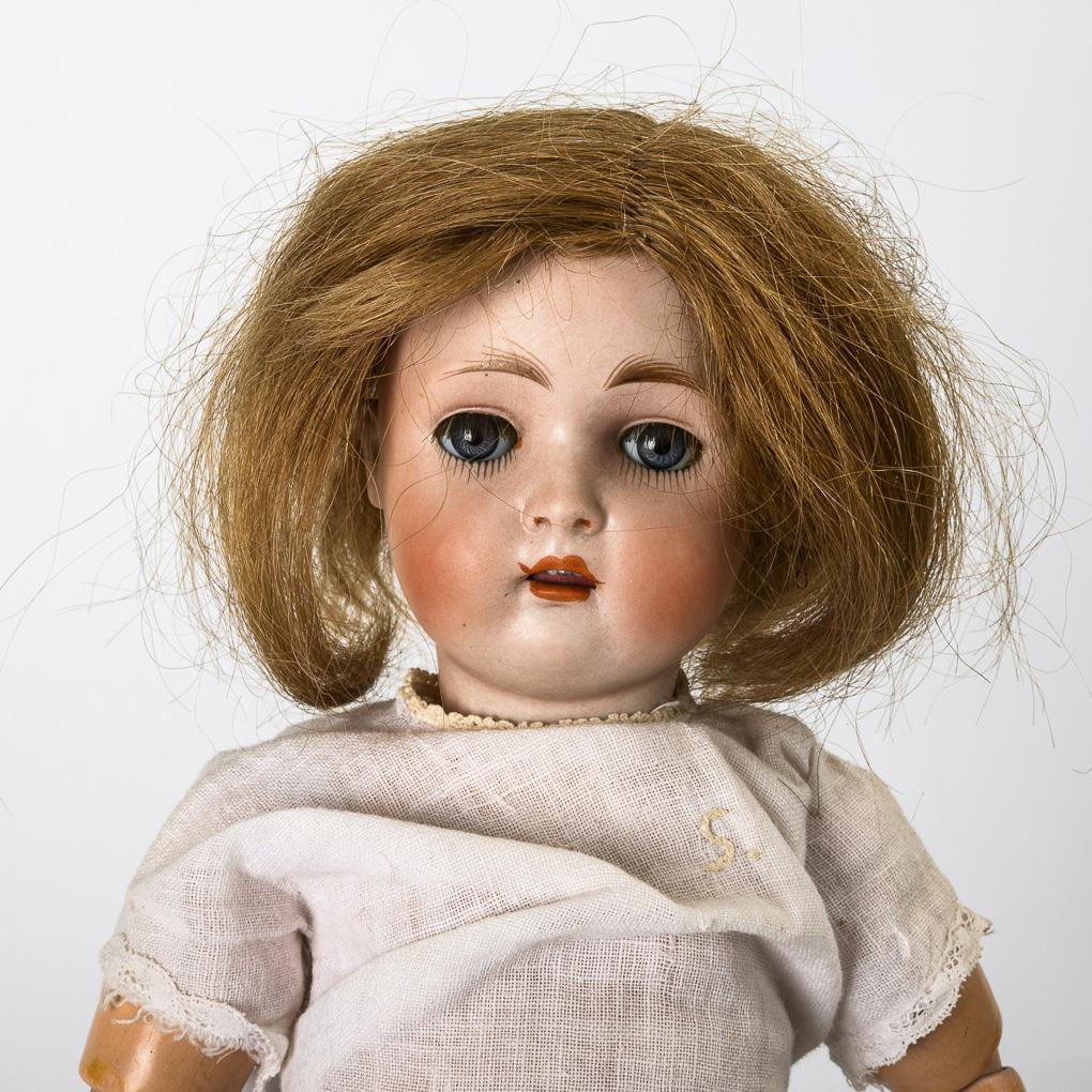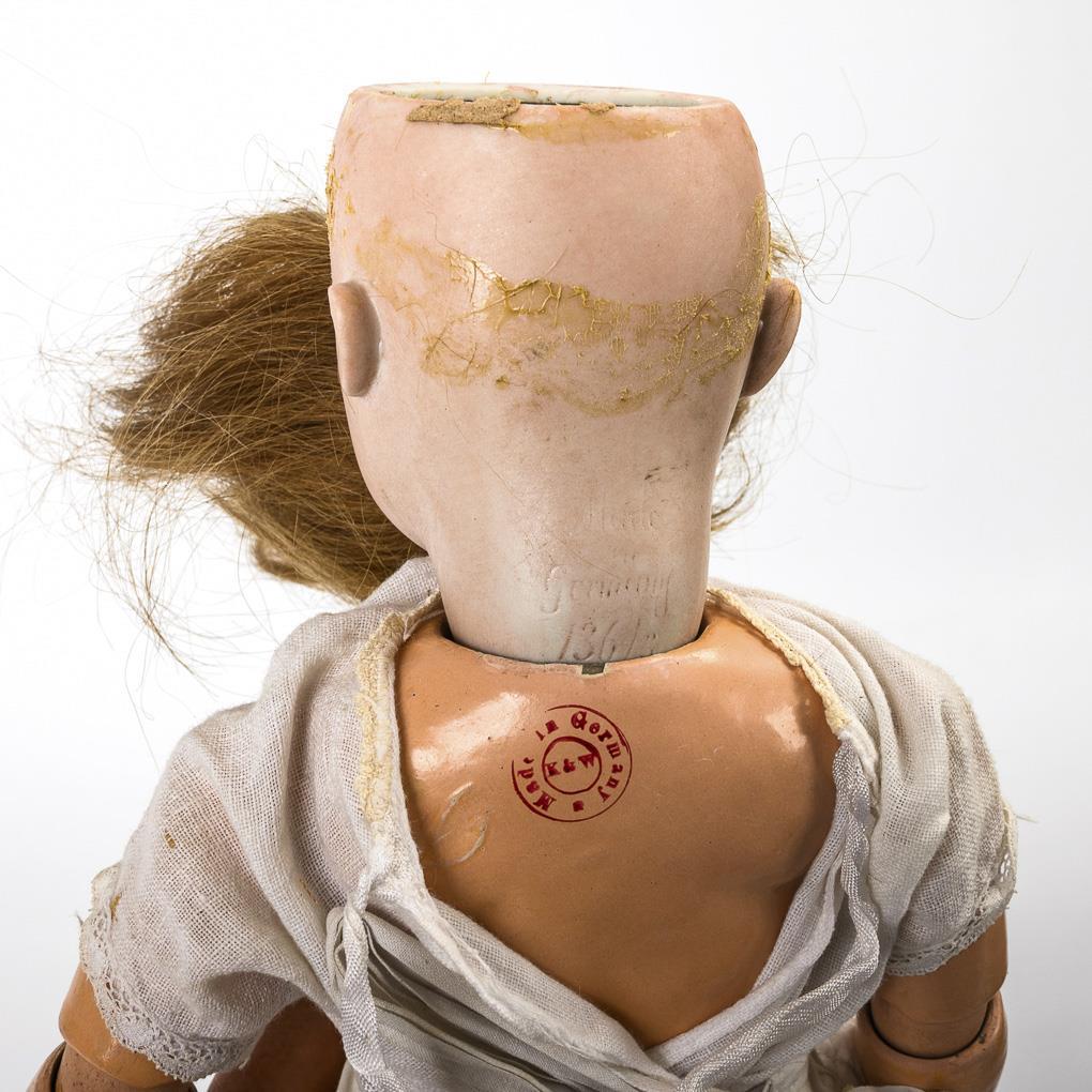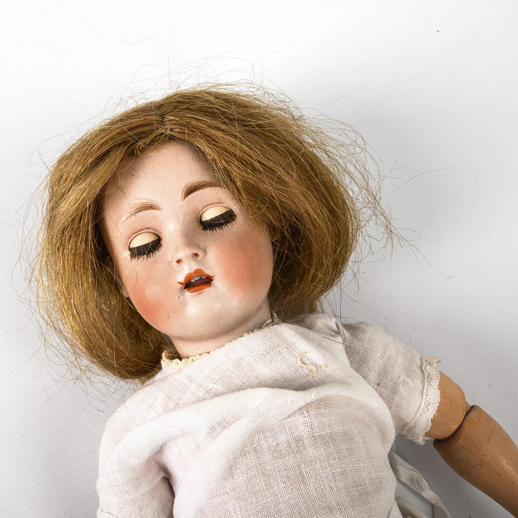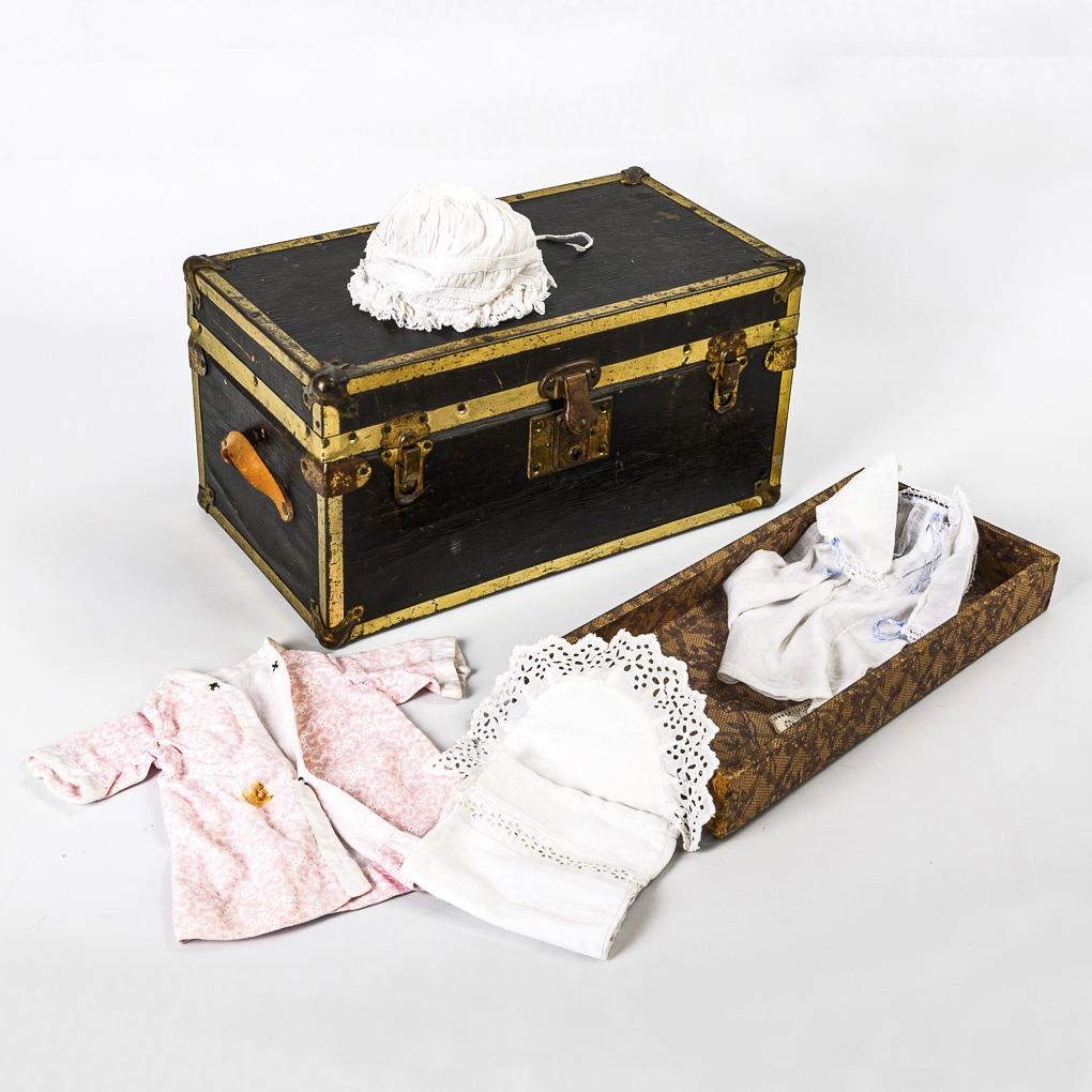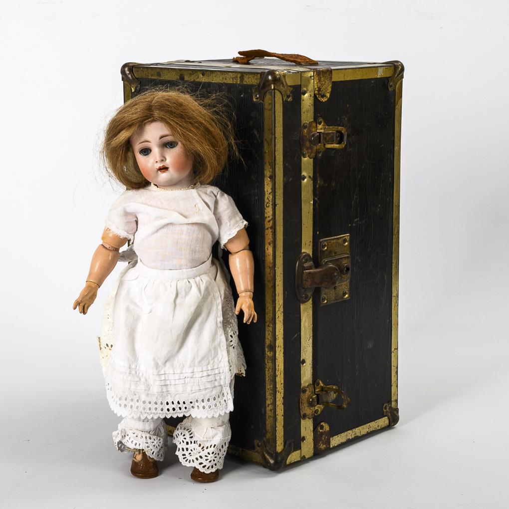 Crank head, blue sleeping eyes, eyelashes, medium blond human hair wig, 11-piece jointed body, white clothing, brown shoes. Head x-rayed: without defects. L 40 cm / Comes with 2 nightgowns, bonnet and pillowcase / Dark brown traveling trunk with metal fittings, inside with adhesive label "Green Toy Works, Trade Mark, USA". Signs of age, 1 handle defective. 21.5 x 41 x 22.5 cm.
