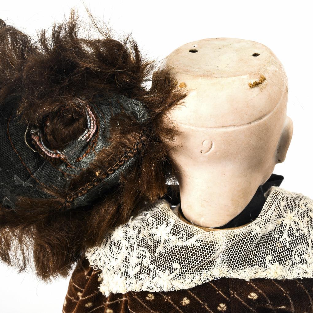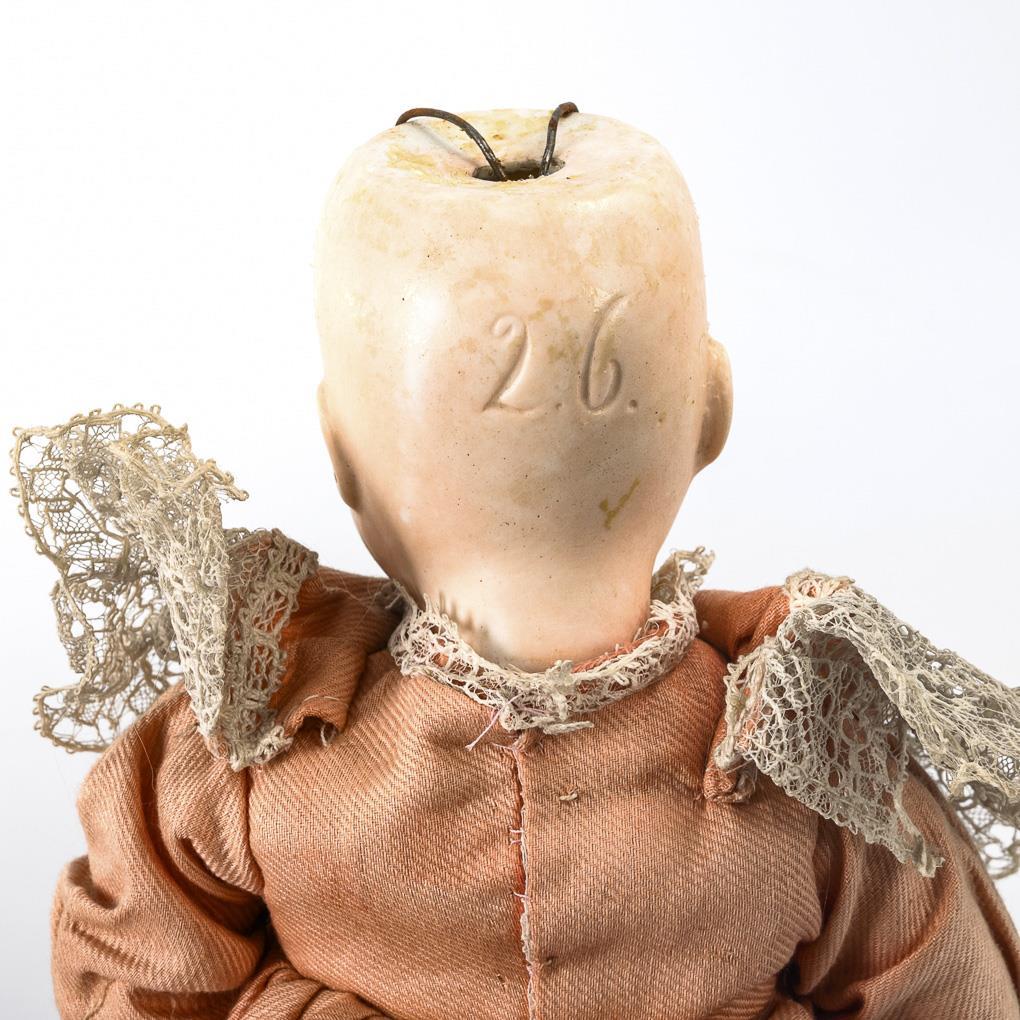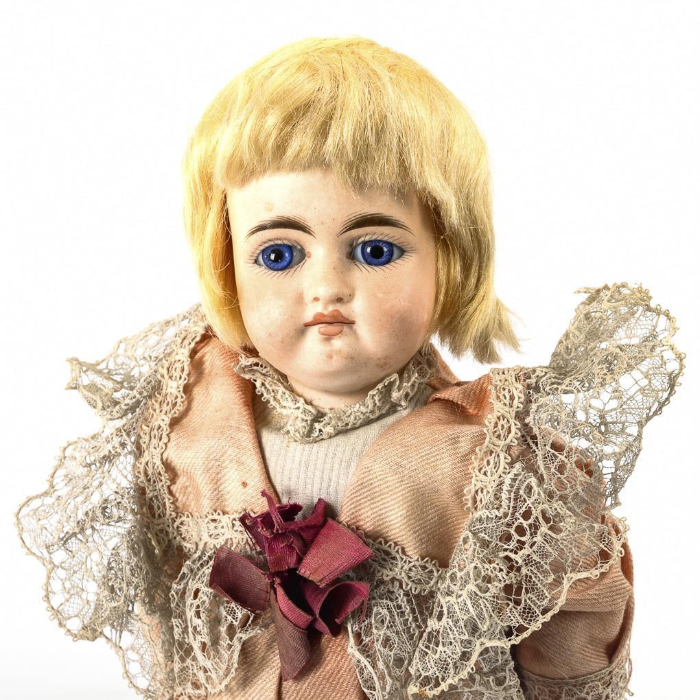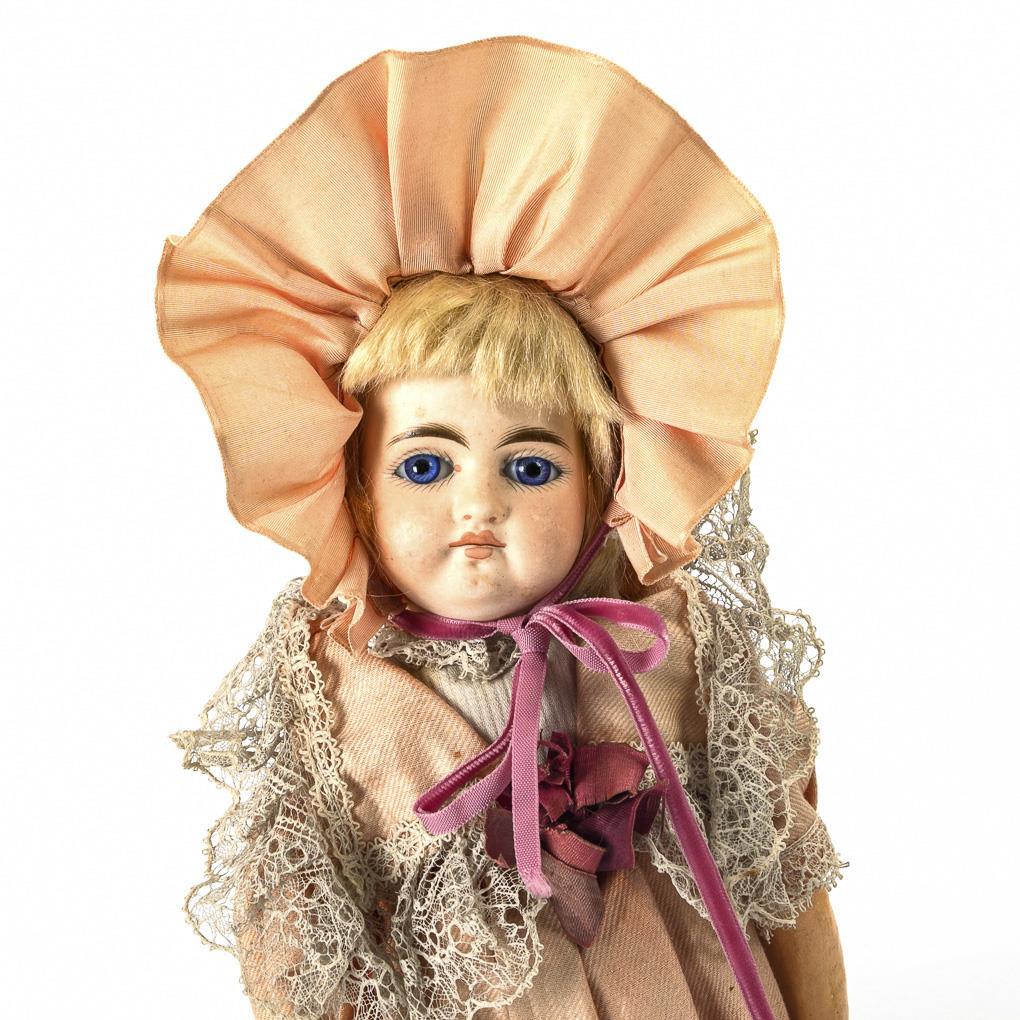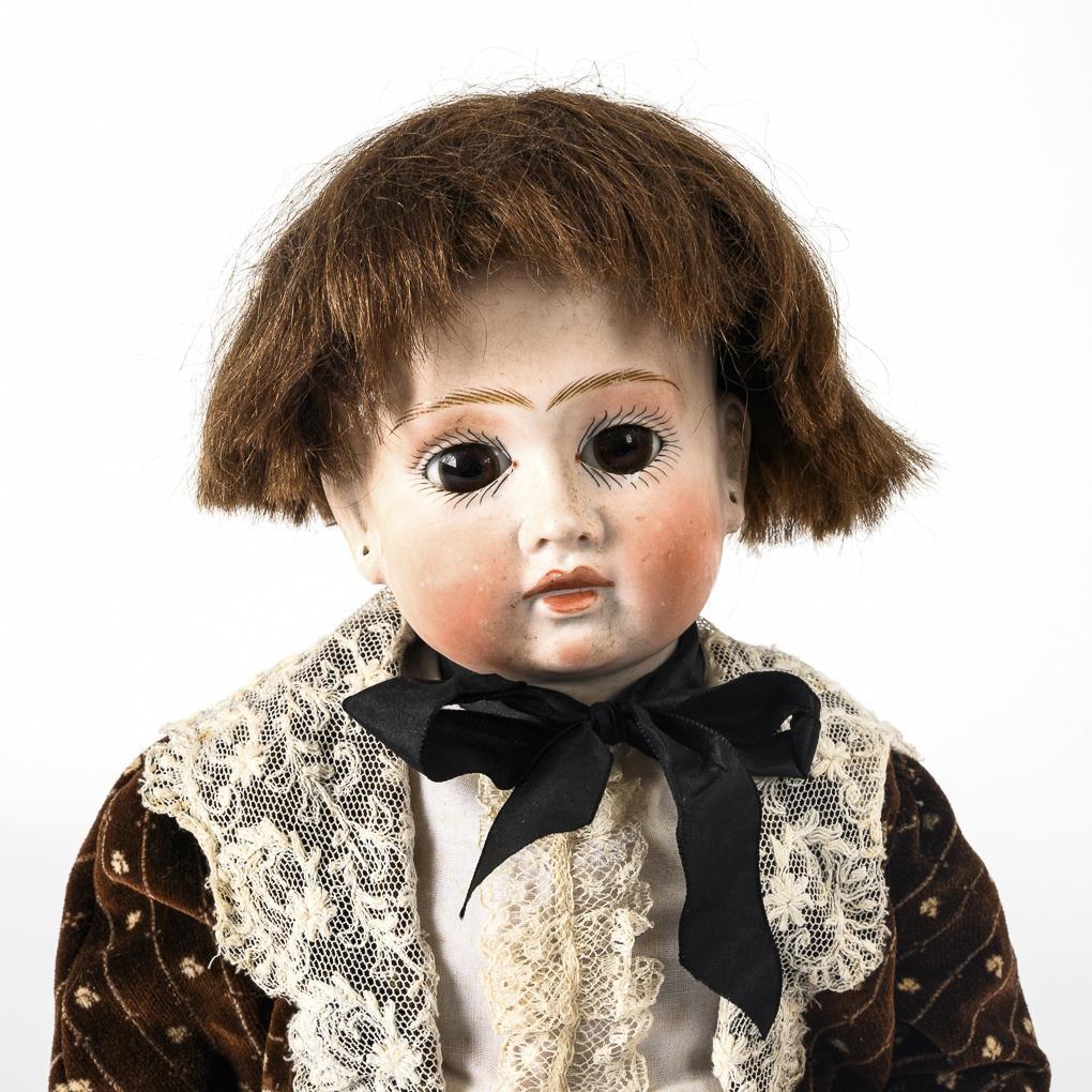 Each with bisque head, fixed glass eyes and mohair wig. Blonde girl (head number 26) with 9-piece jointed body, original pink dress and matching hood. L 37 cm. Boy with brown wig (head number 9), pierced ears, 5-part standing doll's body and sewn-on brown velvet dress. L 34 cm. Boy with small chips on eye and earlobe. Girl with tiny chip to right eye, body painted over, loosely stretched.