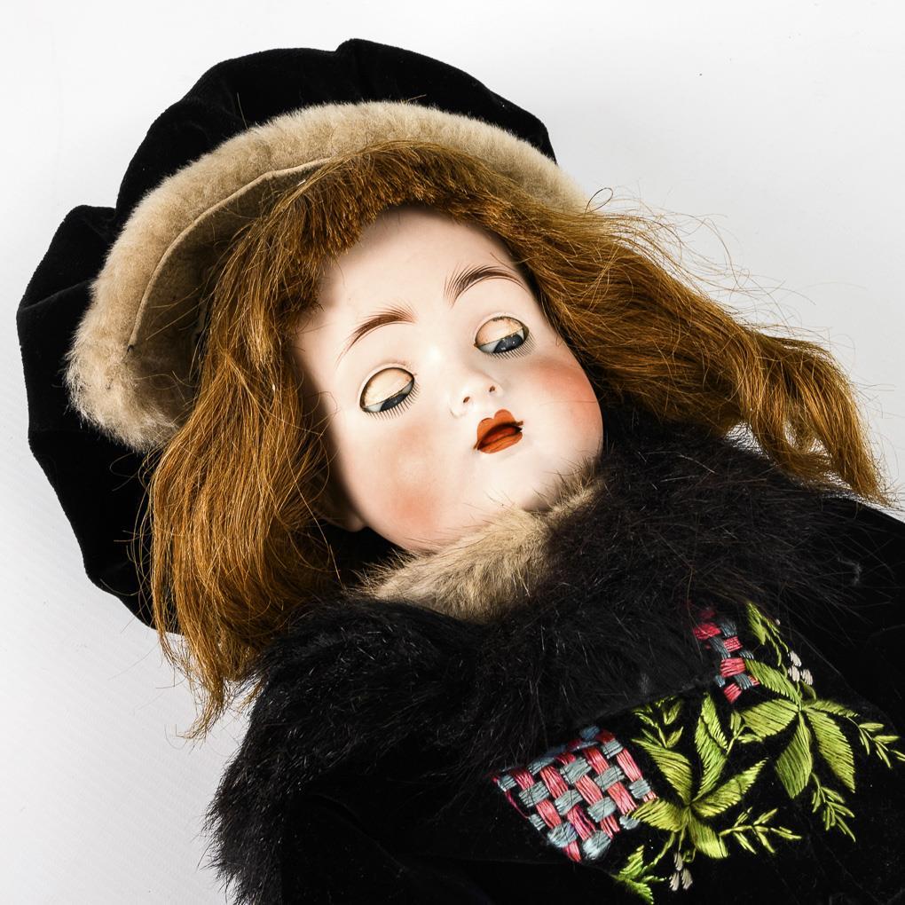Cranked head, blue sleeping eyes, open mouth with movable tongue, light brown real hair wig. 15-part jointed body. Dress with fur collar, matching cap, brown leather shoes. 2 head seams minimally branded.