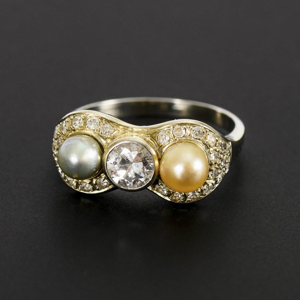 Art deco ring with old-cut diamond, cultured pearls and diamonds.