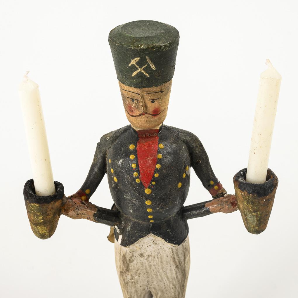 Figure of a miner with 2 candle nozzles and a paper mine leather (so-called "ass leather"). Paint defects, dry cracks, old repairs to the nozzles.