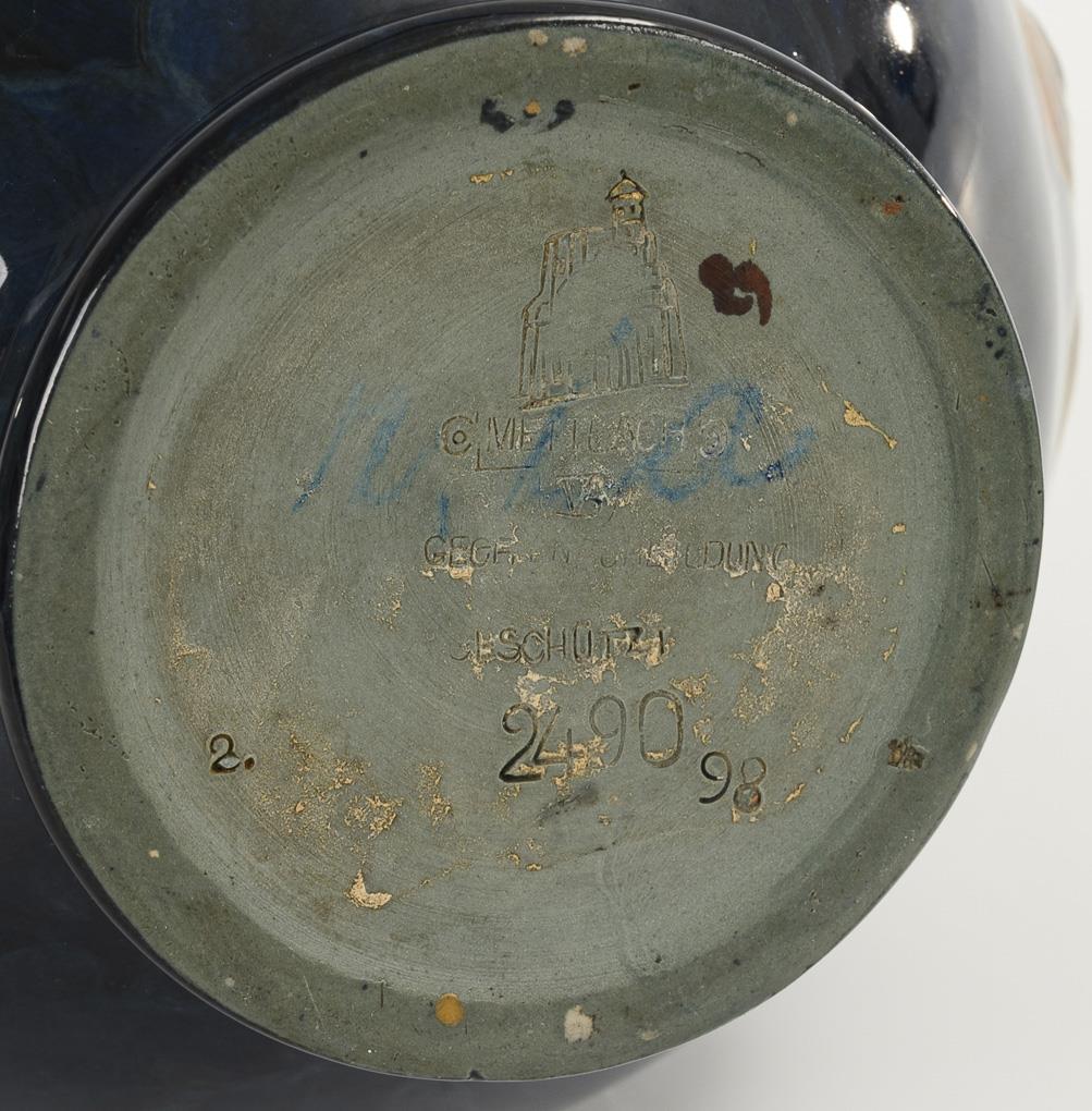 Embossed tower mark "Mettlach" with the addition "Protected against reproduction", from 1887. Model no. 2490.