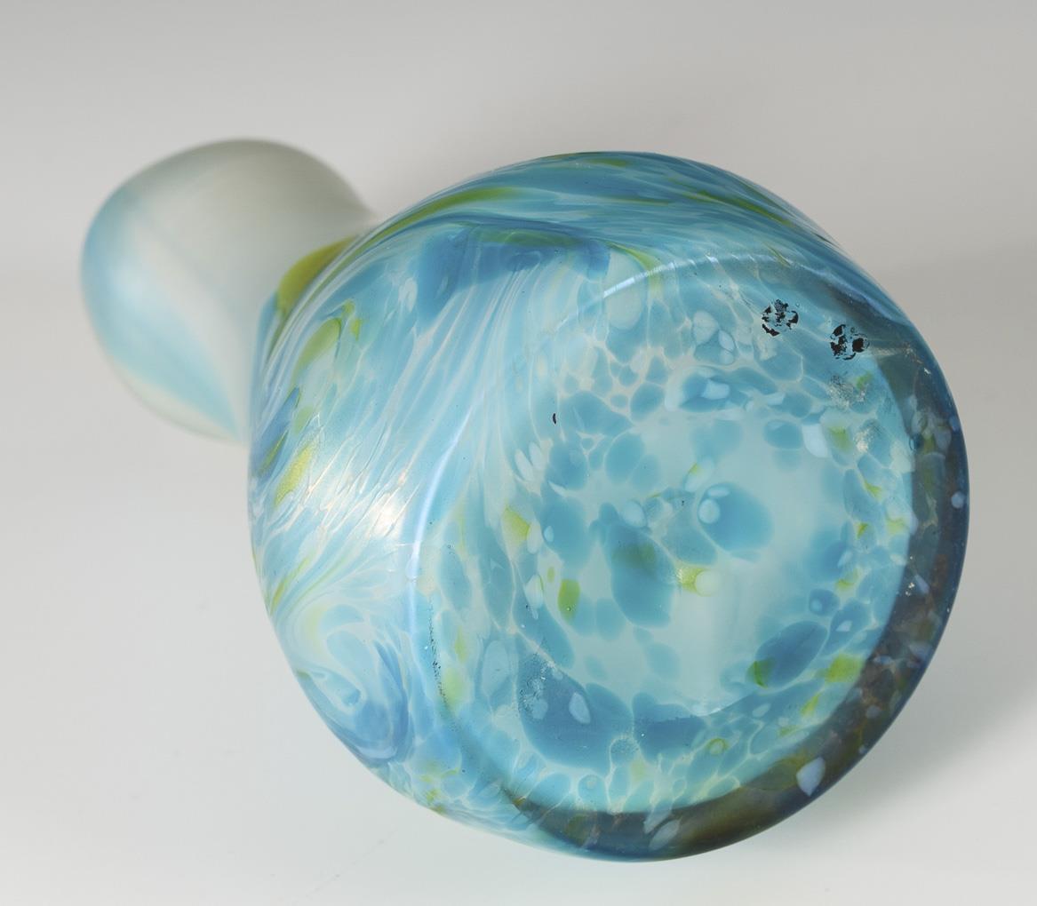 Colorless glass with opal white interior and crushed fusions in turquoise and yellow. H 12 cm.