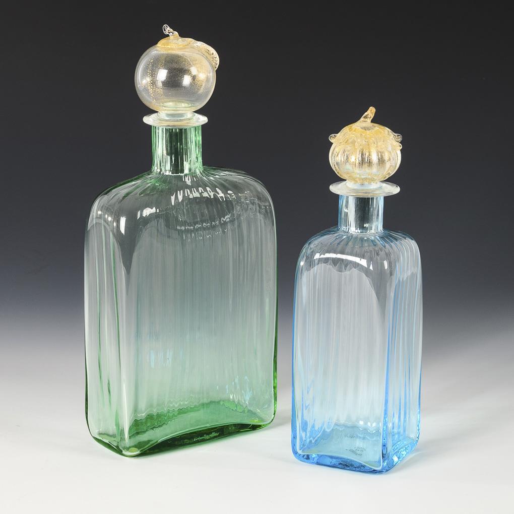Light green or light blue glass, stopper with melted, blown gold foil.