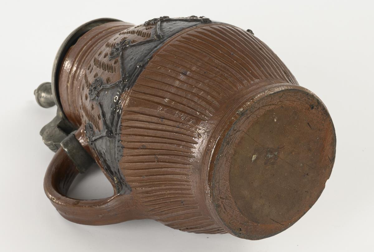 Brown, salt-glazed stoneware, partly engobed in black-brown, notched, incised and molded decoration with impressed quartz chips. H 24 cm.