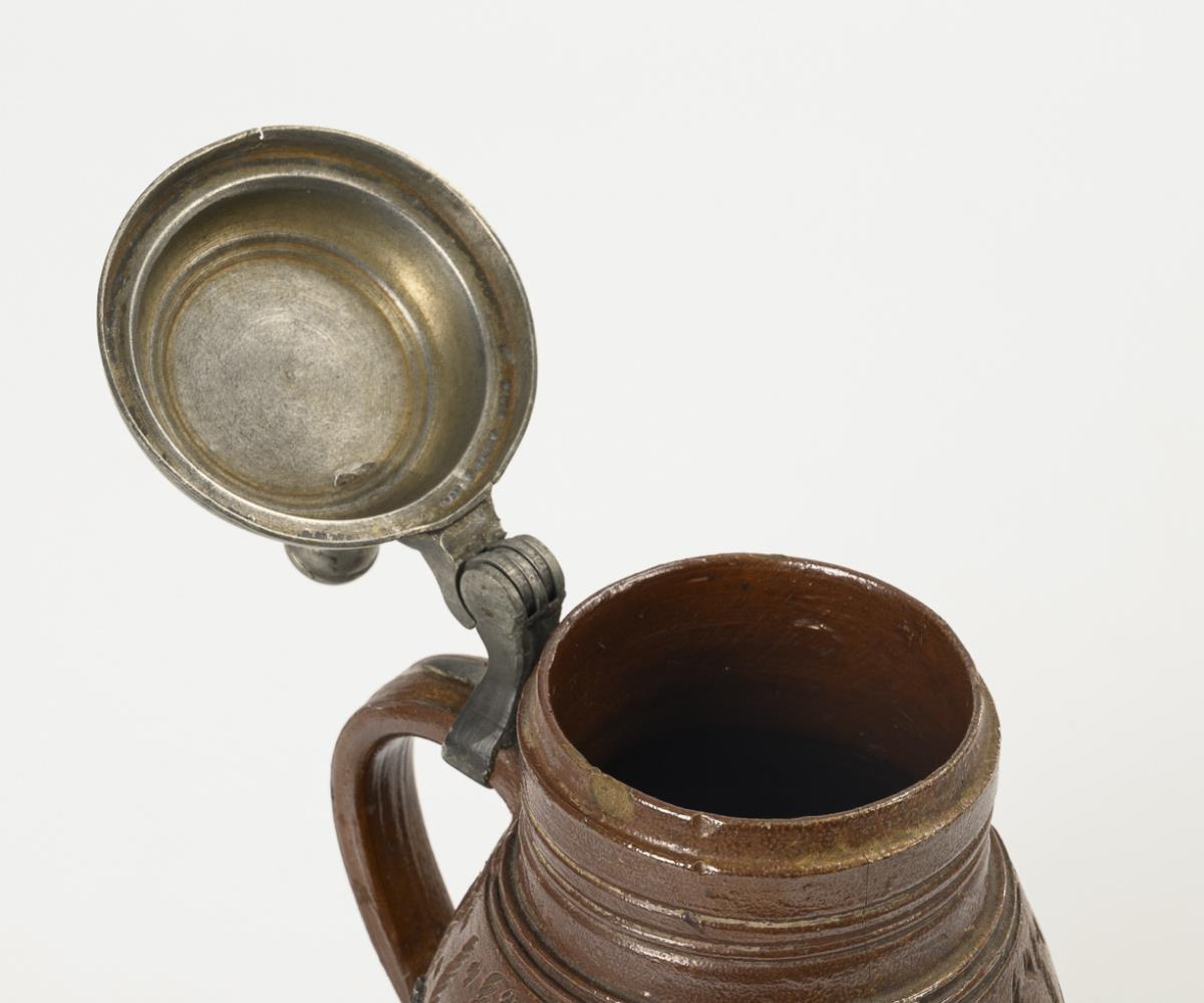 Brown, salt-glazed stoneware, partly engobed in black-brown, notched, incised and molded decoration with impressed quartz chips. H 24 cm.