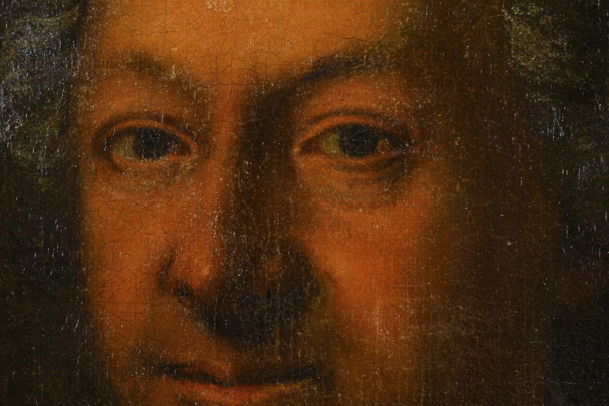 Portrait of a man in a fur-trimmed coat with ruffled shirt and gray plaited wig. Doubled canvas.