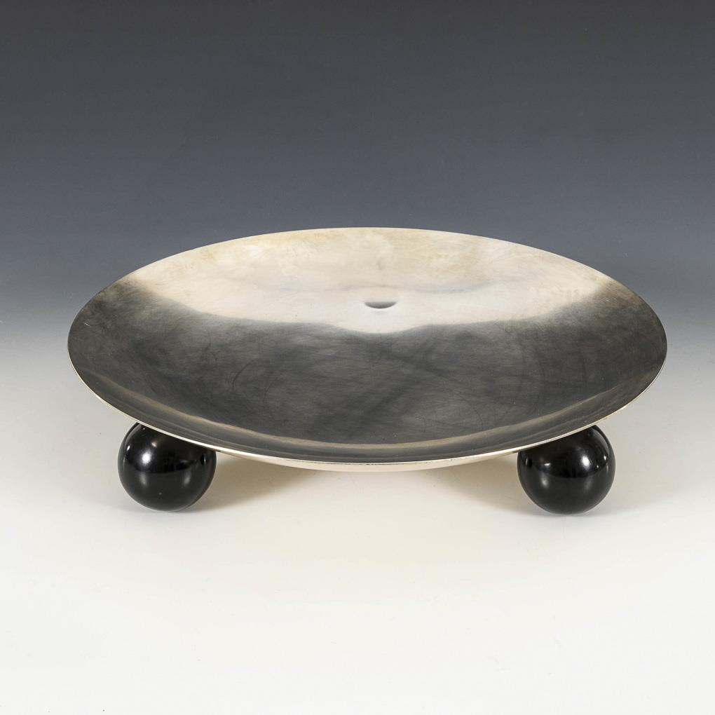 Ikora silver-plated metal, black lacquered wood. H 8 cm, Ø 35.5 cm.