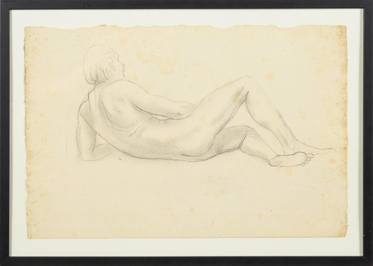 Back view of a reclining male nude. Beginning stained at the edges, irregular margins.