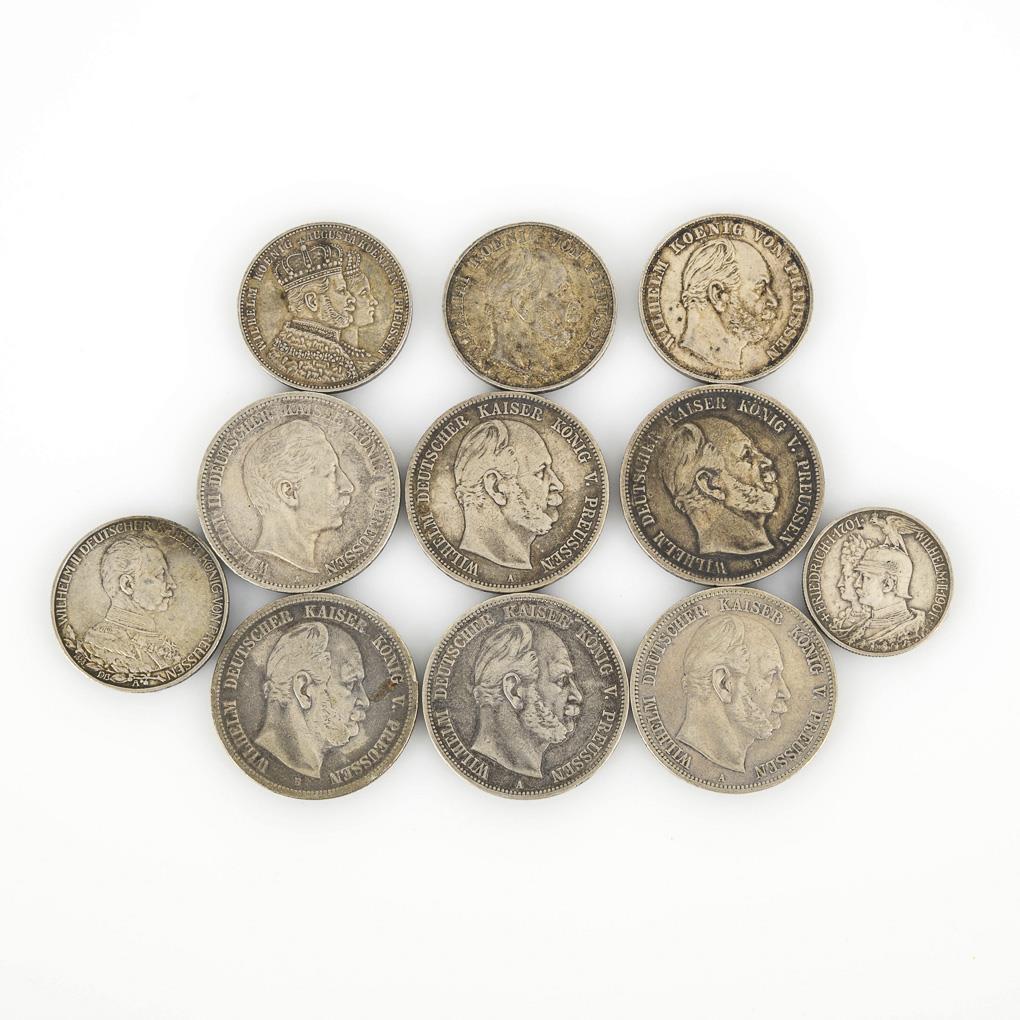 5x 5 Mark, 1875, 2x 1875, 3x 1876, "Wilhelm Deutscher Kaiser König v. Preussen". / 5 Marks 1895, "Wilhelm II German Emperor King of Prussia". / 2 "Siegesthaler" 1871, "Wilhelm King of Prussia". / "Kroenungsthaler 1861", "Wilhelm Koenig Augusta Koenigin v. Preussen" / 3 Marks 1913, Wilhelm II in uniform, "Wilhelm II German Emperor King of Prussia". / 2 Mark 1901, "Friedrich I. 1701, Wilhelm II. 1901". Condition: very nice.