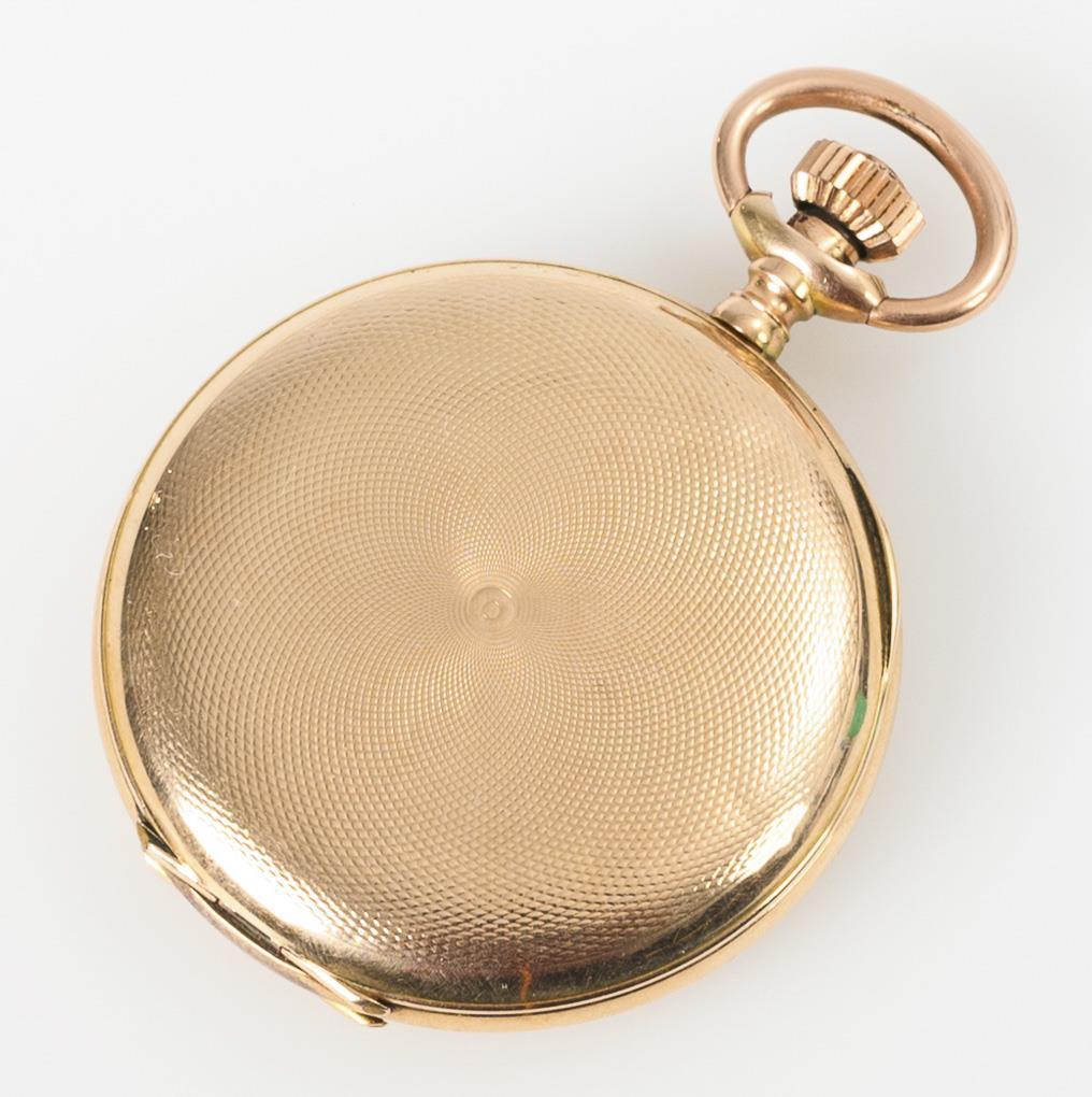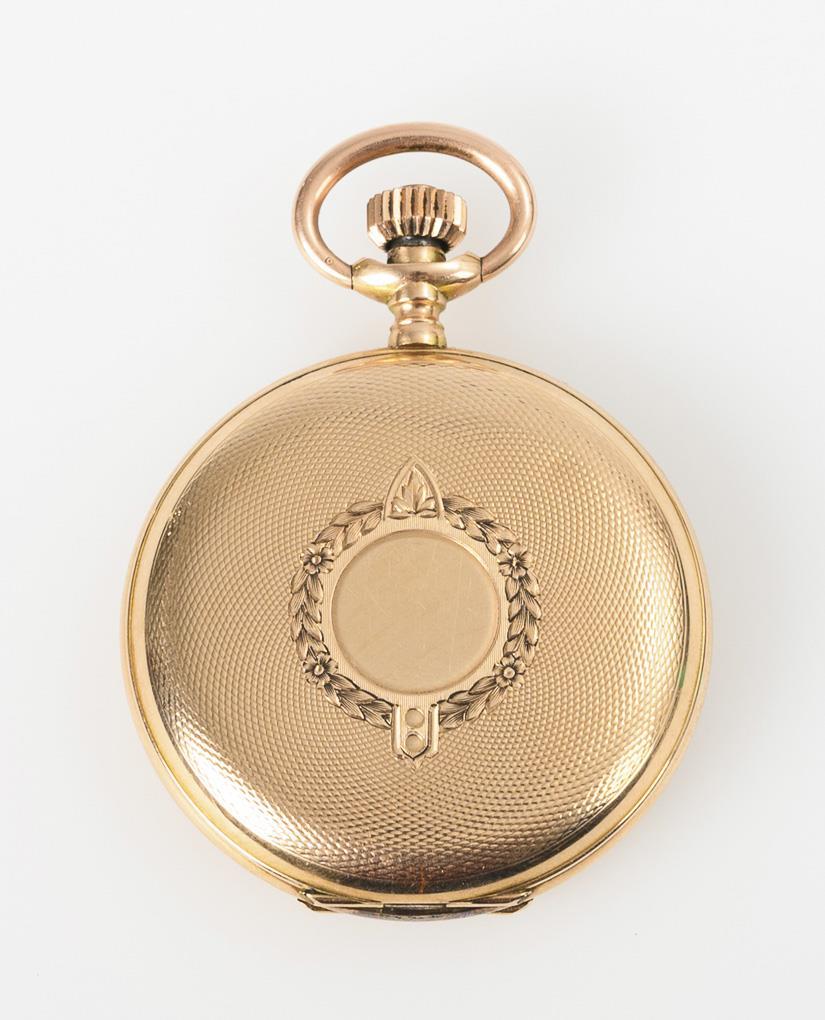 Marked movement with anchor escapement, blued Breguet balance spring, screw compensation balance, jewels, crown winding. Running. White enamel dial with recessed center, Arabic numerals, minute ring, small second and Louis XV hands.