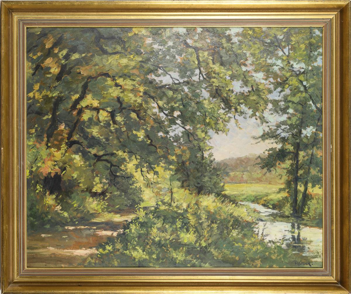Light green forest and meadow landscape with stream and path in the sunshine. Minimal traces of age.