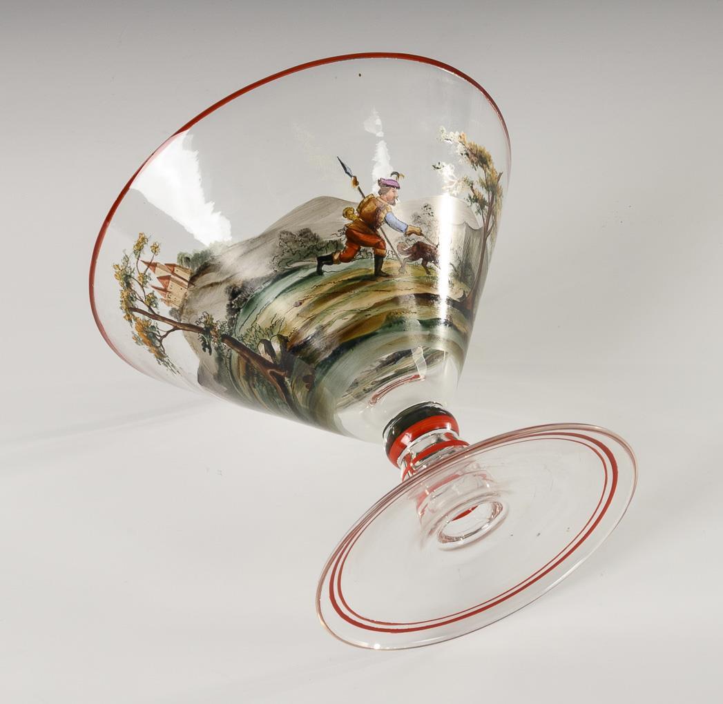 Conical bowl, triple-jointed shaft, round base. On the bowl the motif of a wild boar hunt painted over overprint. 2 minimal chips to the rim.