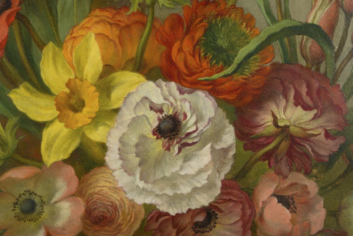 Bouquet of flowers painted in the style of the old masters with various flowers in a golden metal vessel in bright light. Traces of age.