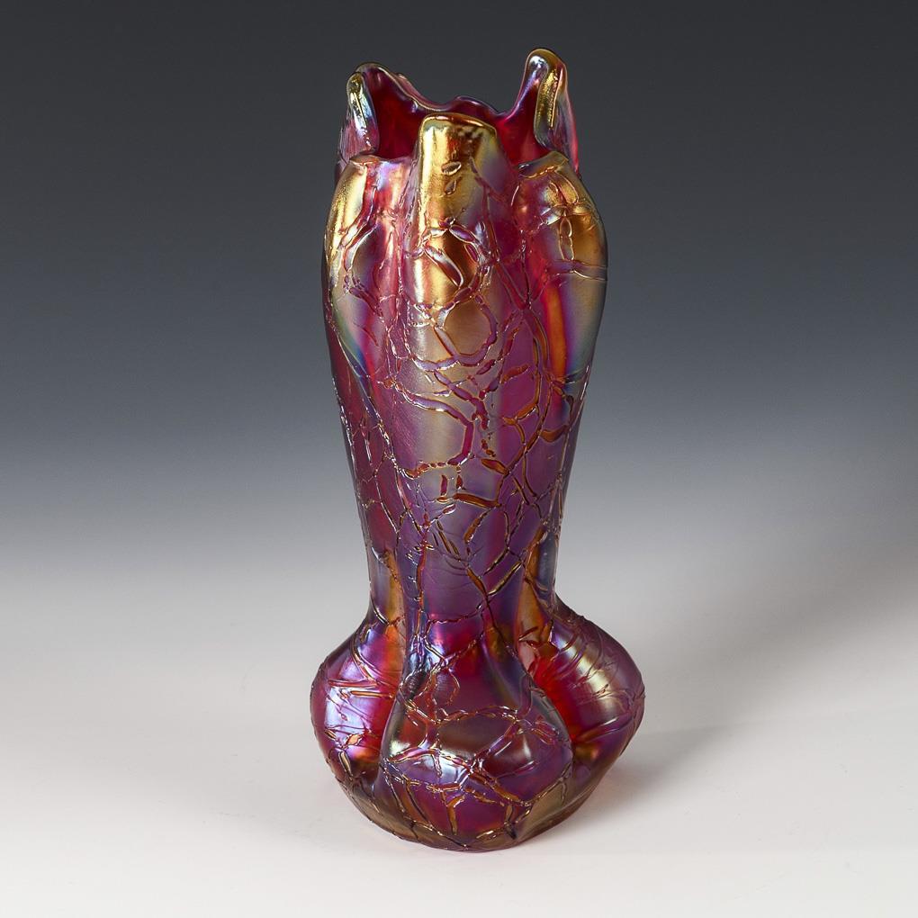 Colourless glass with red inner rim and rolled-in, colourless thread net, iridescent. H 18.5 cm.
